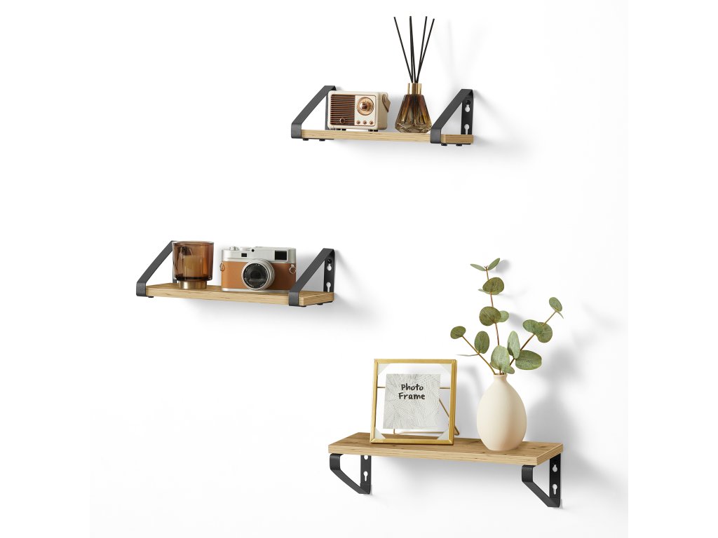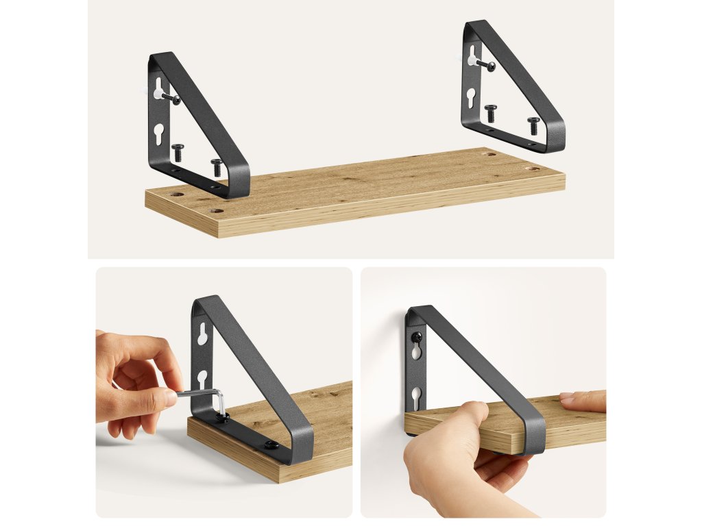 Három különböző méretű polccal érdekes kompozíciót hozhatsz létre a falon, és rengeteg helyet kínálnak könyveknek, dekorációknak, növényeknek, fényképeknek vagy apró kiegészítőknek. A tömör forgácslap szerkezetnek és az acélkonzoloknak köszönhetően a polcok stabilak és mindennapi használatra alkalmasak.
