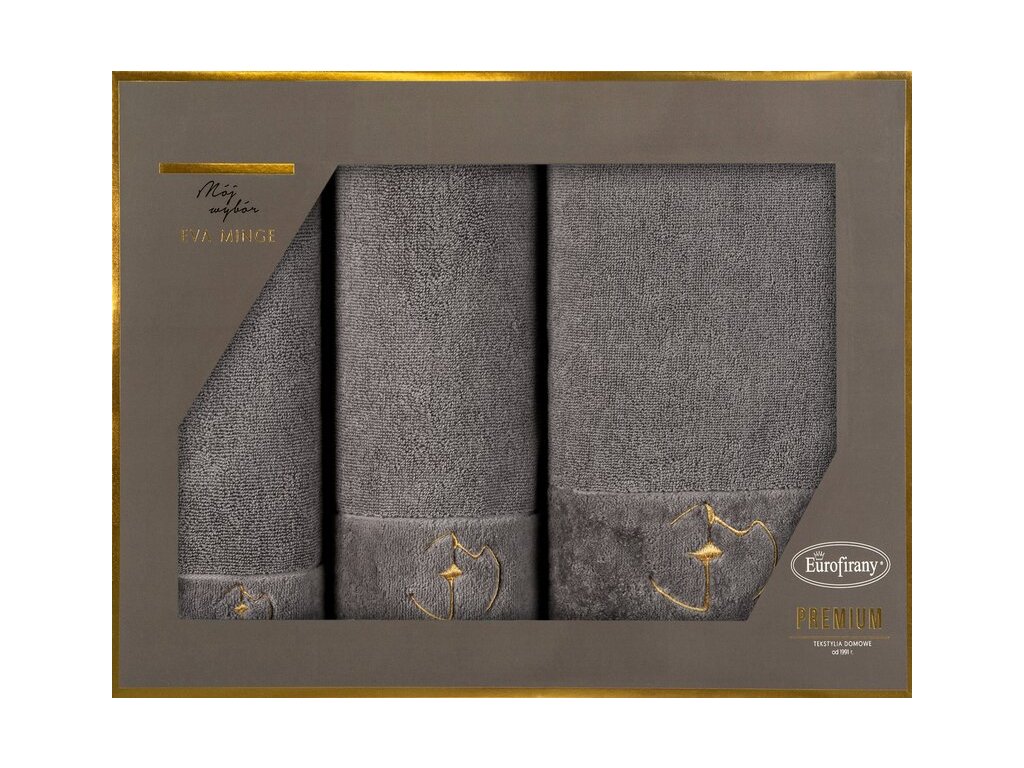 Az EVA MINGE kollekció három törölközőből álló szettje, elegáns kartondobozban, ideális választás eredeti és praktikus ajándéknak.