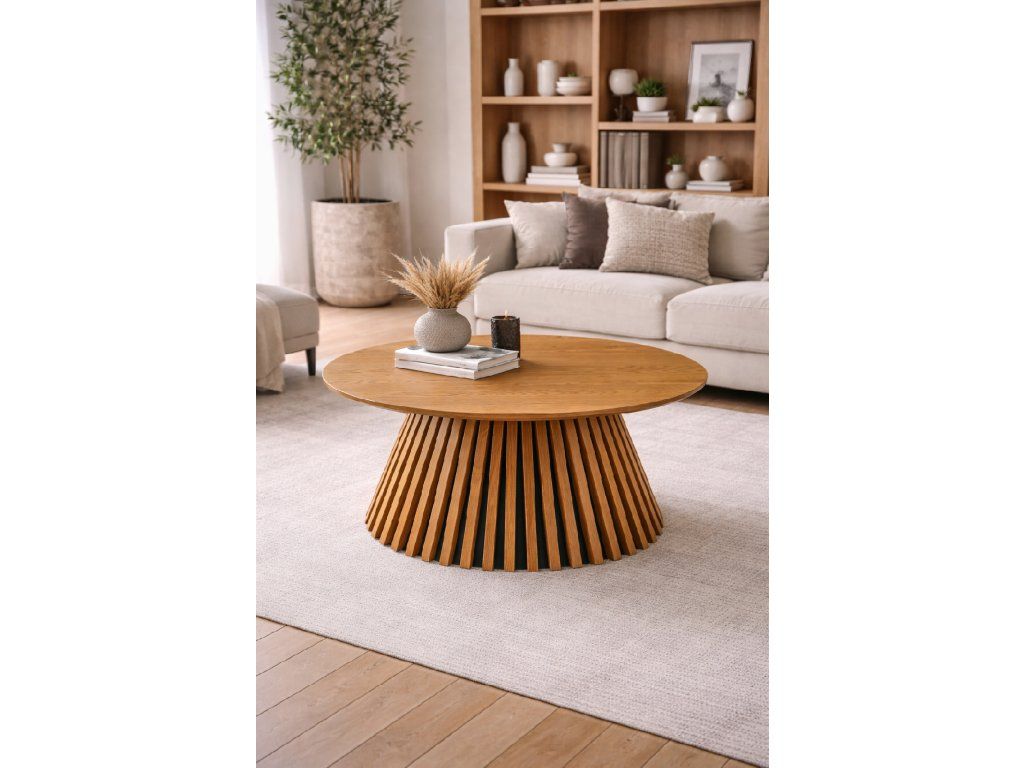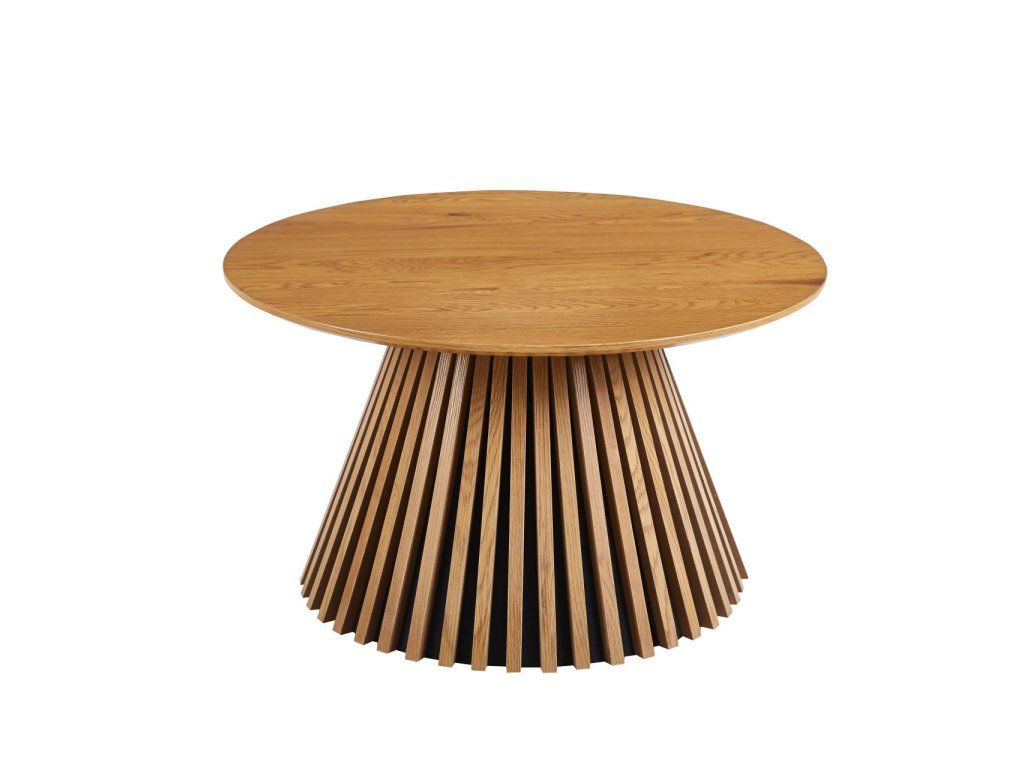Az asztal domináns eleme a finom faerezetű, kerek teteje , amely kellemes kontrasztot alkot a jellegzetes léces talppal . Elegáns körben elrendezett függőleges falécekből áll, ami építészeti jelleget kölcsönöz az asztalnak, és igazi dizájn szoliter asztallá teszi.