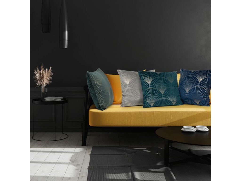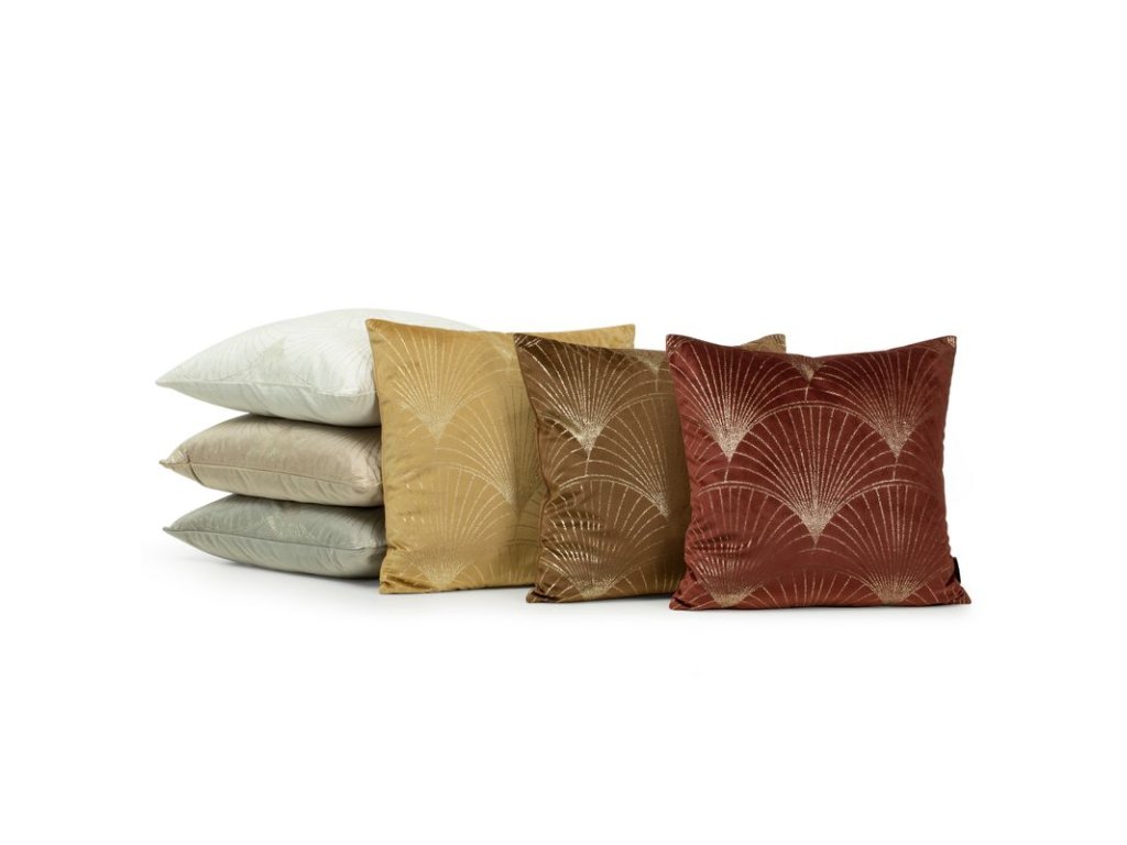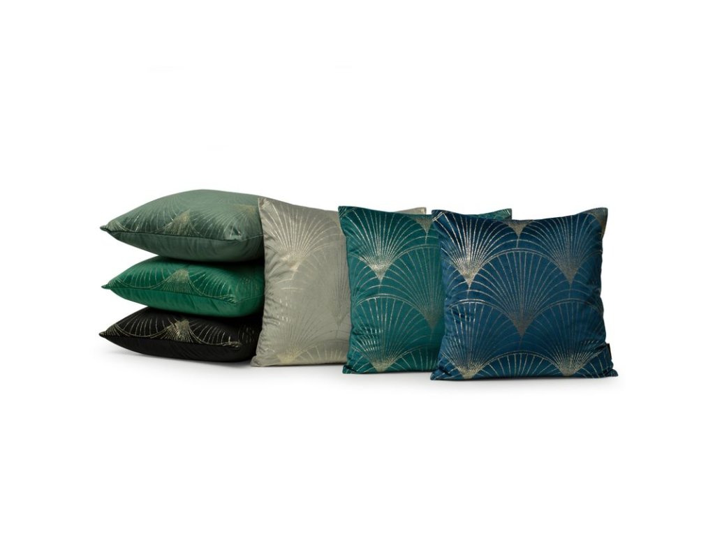 Bársony dekoratív párnahuzat a BLINK kollekcióból, legyező alakú motívumú aranymintával díszítve.