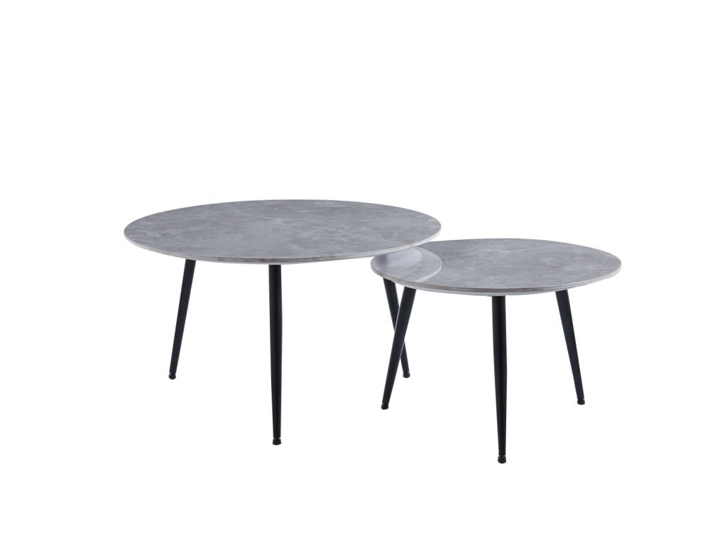 Fedezze fel a modern dizájn és a funkcionalitás tökéletes kombinációját ezzel az elegáns, betonhatású, két dohányzóasztalból álló szettel. A fényes felületű, betonhatású kerámia munkalapok ipari jelleget és autentikus karaktert kölcsönöznek otthonának. A fekete porszórt fém lábak stabilitást biztosítanak és hatékony kontrasztot alkotnak.