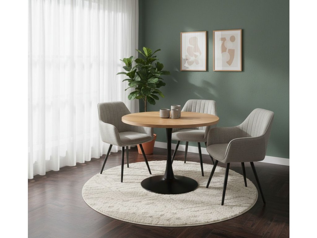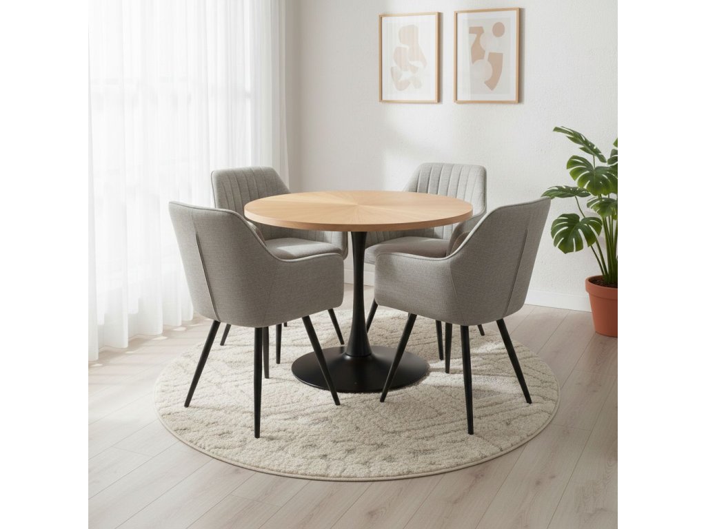 Kombináld egy natúr tölgyfa étkezőasztallal és fekete fém kiegészítőkkel (lámpa, váza), hogy megismételd a szerkezet vonalát, és egy komplett, luxus megjelenésű szettet hozz létre.