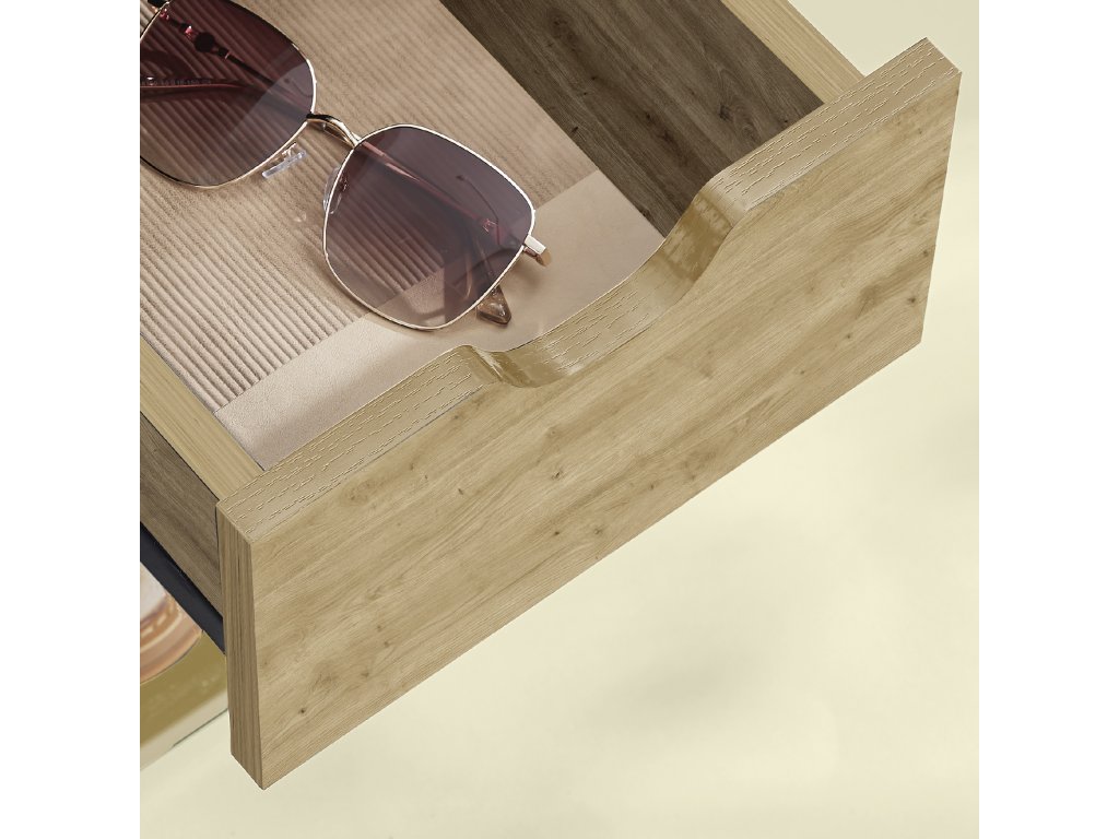 A stílusos cipőszekrény kényelmes ülőpárnával praktikus és elegáns megoldás bármely előszobába. A meleg tölgyfa kézműves dekoráció természetes és otthonos megjelenést kölcsönöz a belső térnek, így a szekrény könnyen kombinálható modern, loft és klasszikus bútorokkal.