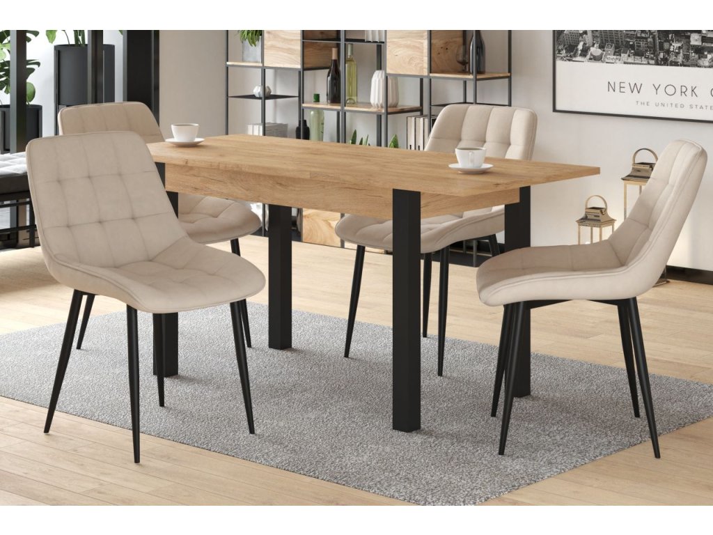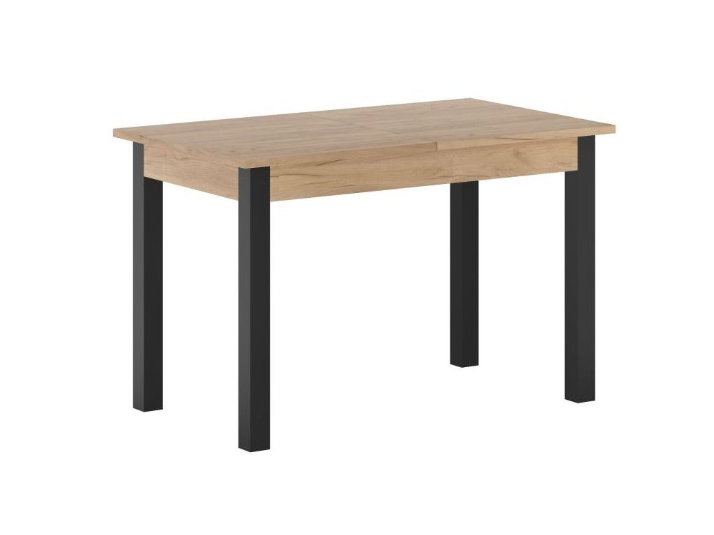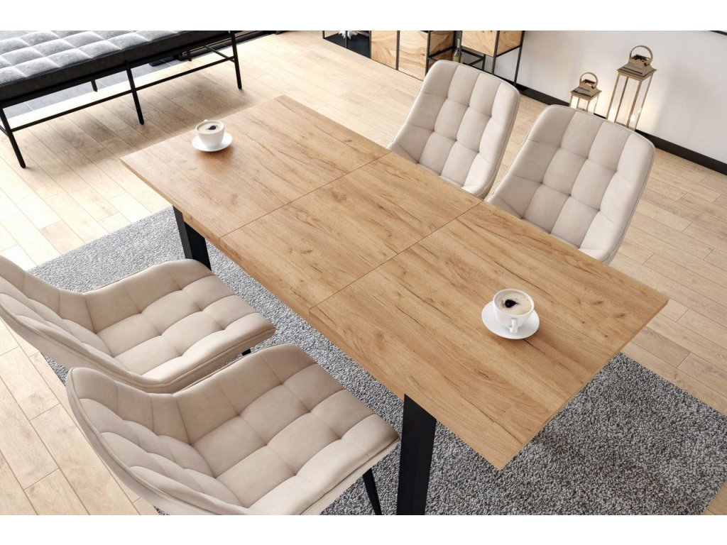 A modern megjelenést az arany színű kézműves tölgyfa dekor és a fekete lábak kombinációja adja, amely illik az ipari, modern és skandináv enteriőrökbe. Az asztallap laminált bútorlapból készült - praktikus a karbantartása és alkalmas a mindennapi használatra. Az élek ABS szalaggal vannak megerősítve, ami megvédi az éleket a sérülésektől és növeli a tartósságot. A stabilitást a fekete MDF- ből készült tömör lábak biztosítják.