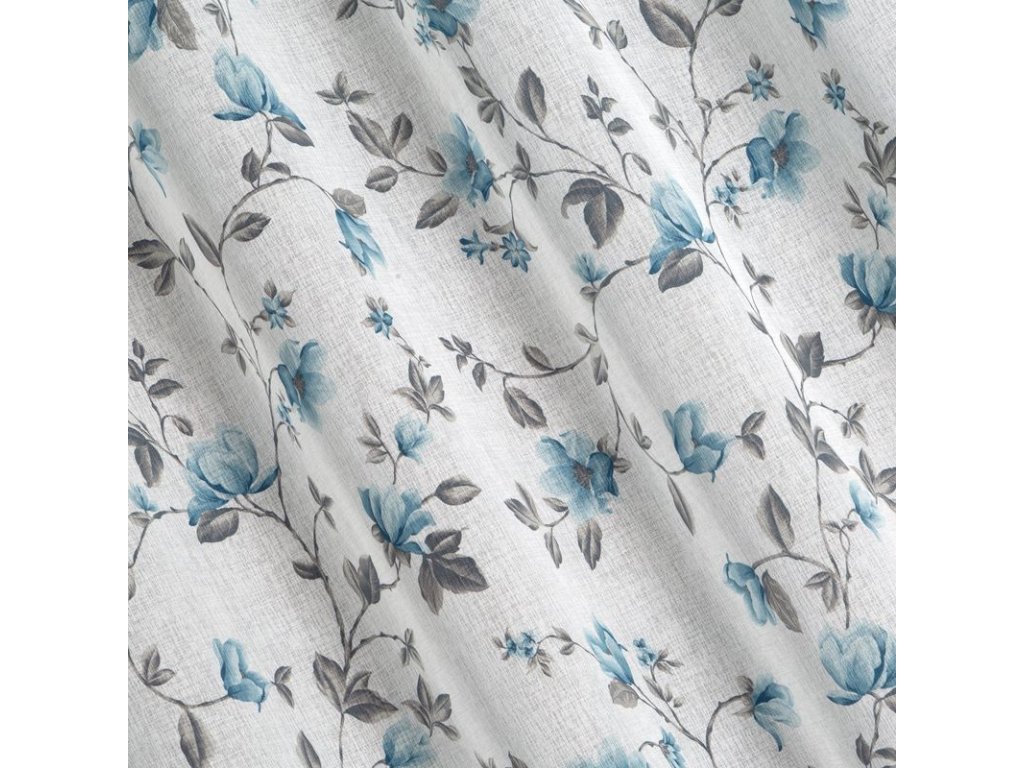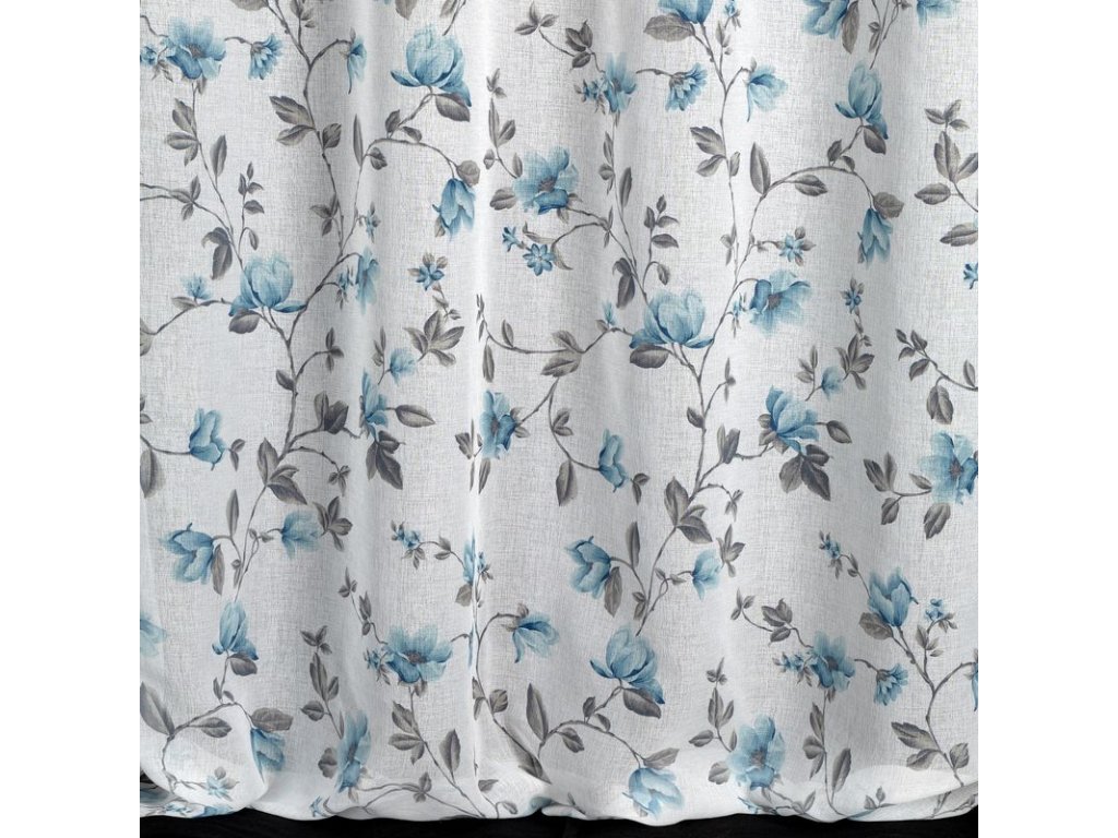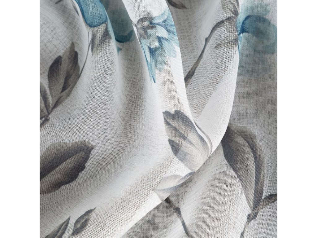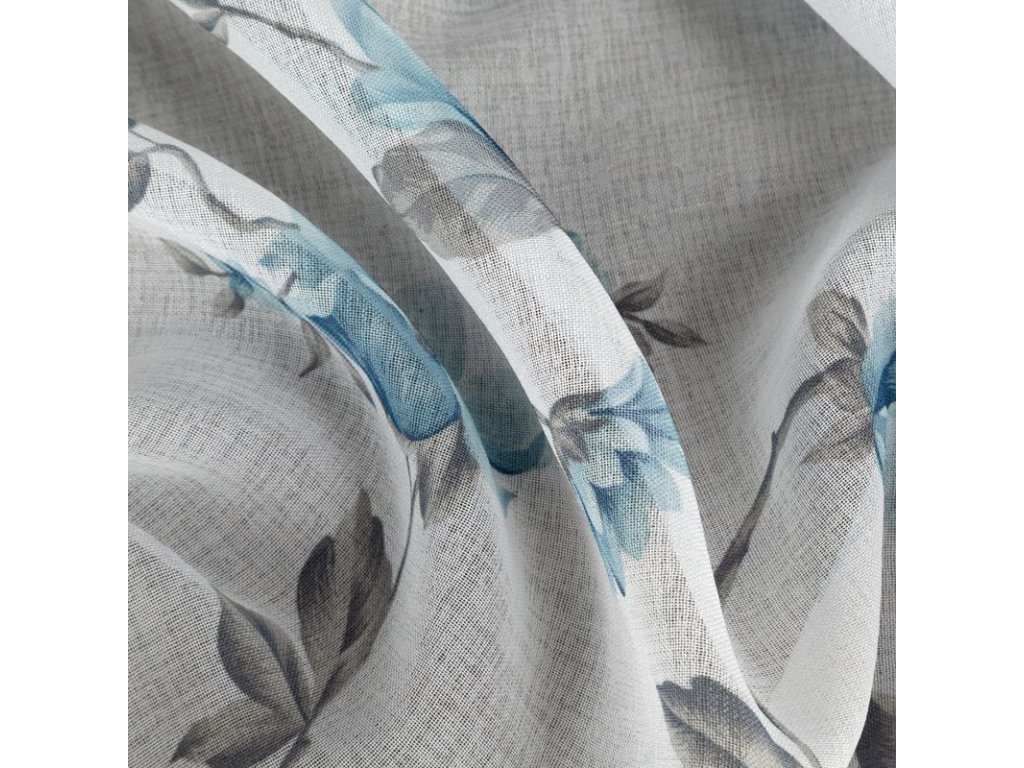 A kék virágmintával nyomott, félig áttetsző szövet remekül mutat majd ablakdíszként klasszikus és modern enteriőrben is, különösen modern öko stílusban.