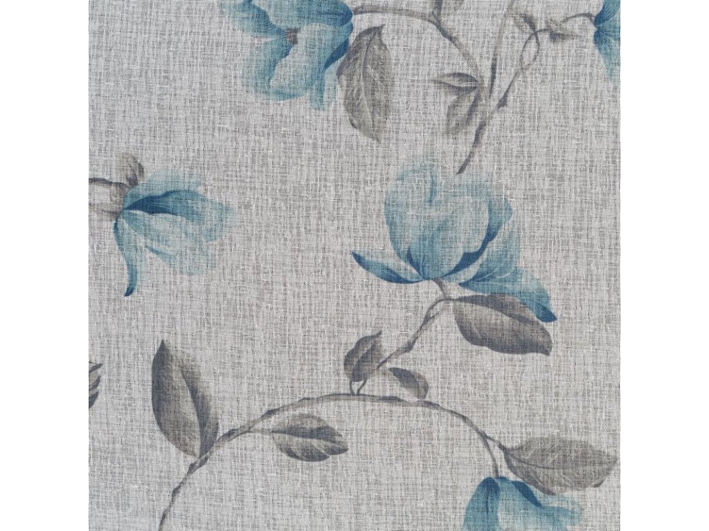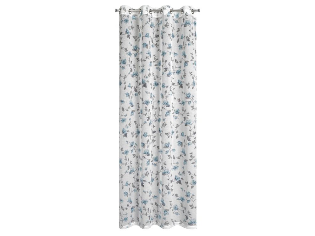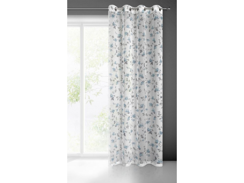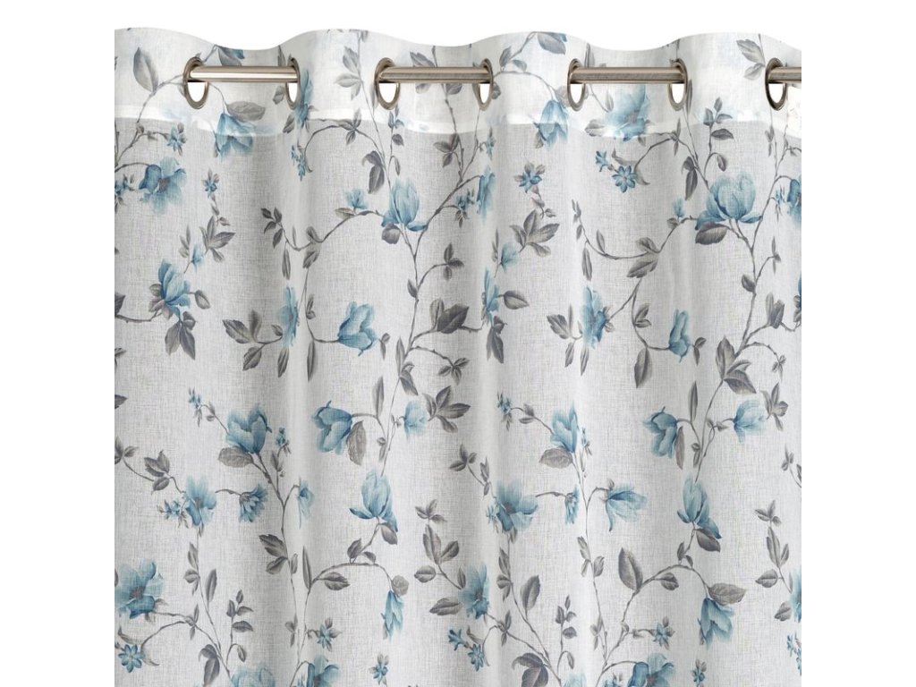 A kék virágmintával nyomott, félig áttetsző szövet remekül mutat majd ablakdíszként klasszikus és modern enteriőrben is, különösen modern öko stílusban.