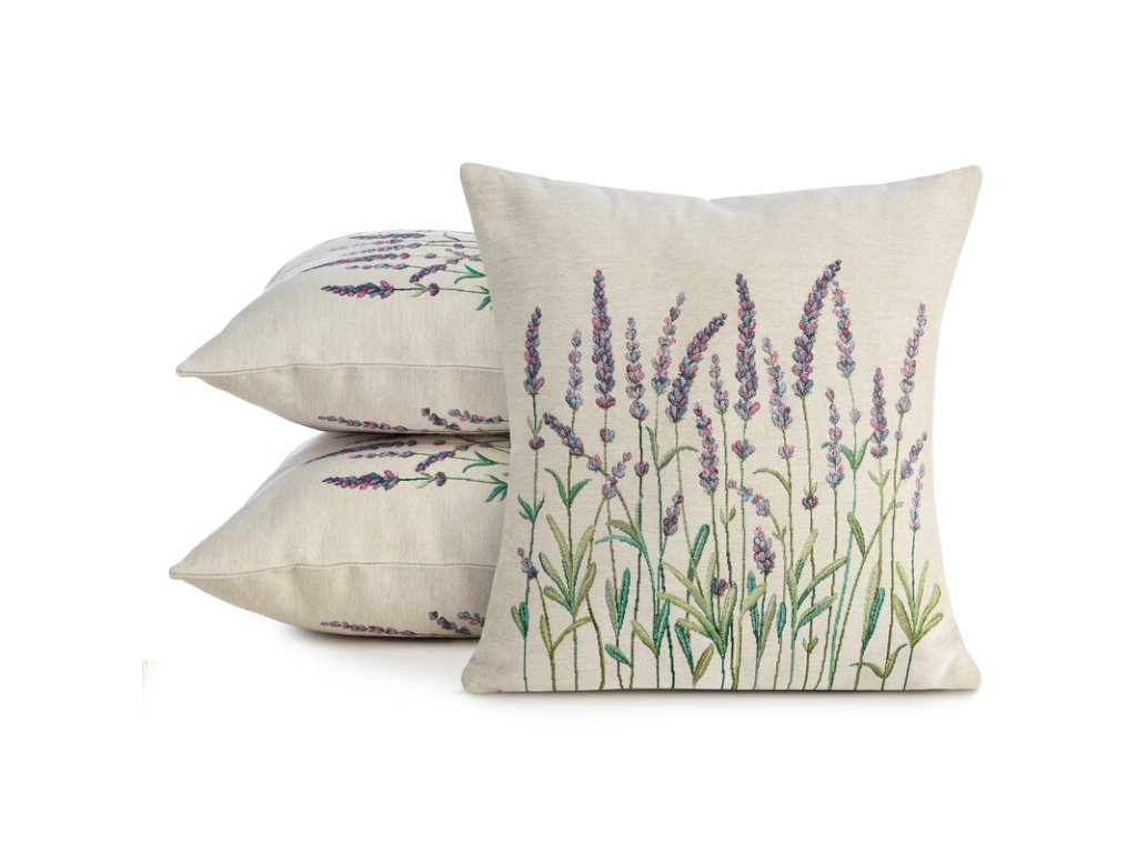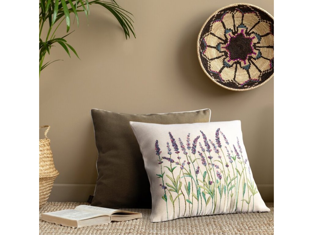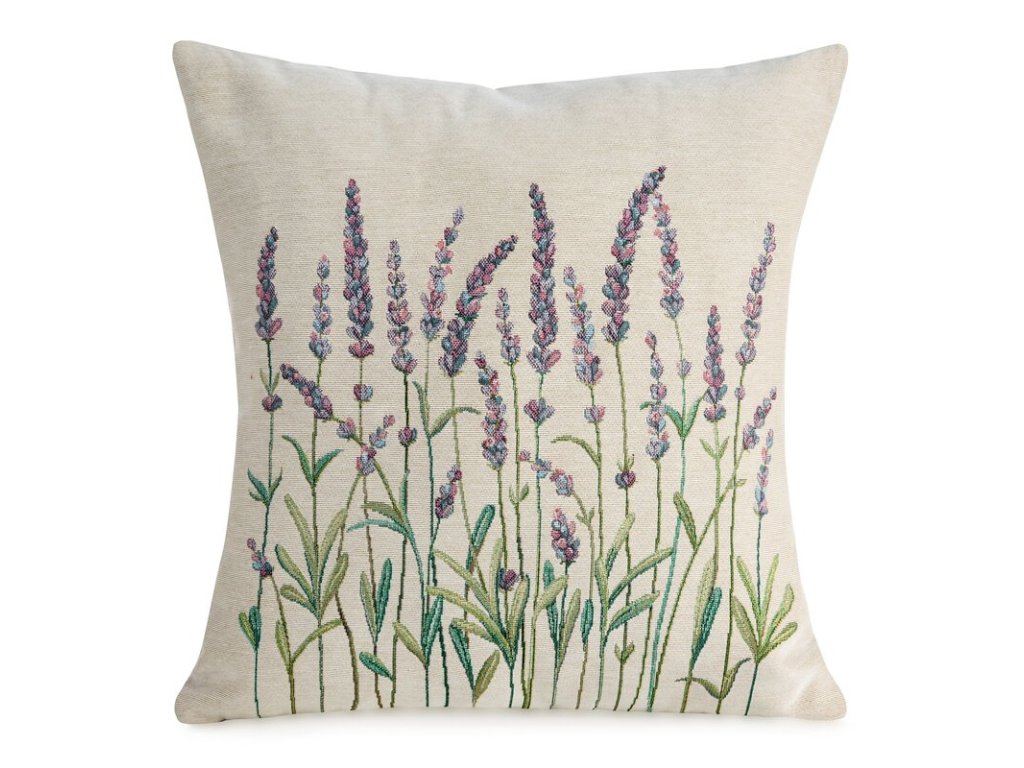 Vigyen idilli, természetes hangulatot otthonába egy lágy, natúr árnyalatú, színes levendula mintával díszített gobelin párnahuzattal.