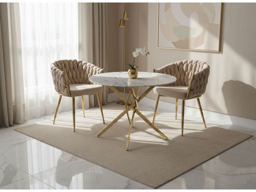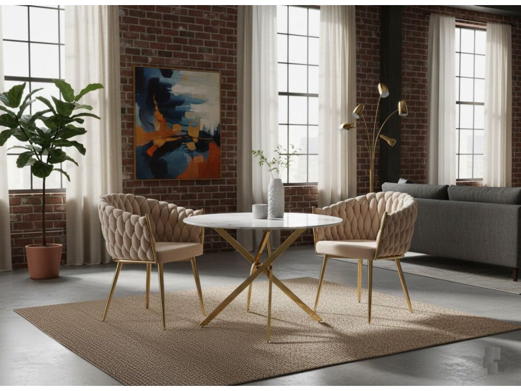 Ez a luxus bársonyból készült szőtt szék egy igazi dizájngyöngyszem, amely azonnal magára vonzza a figyelmet, és otthonod domináns elemévé válik. Az eredeti szőtt háttámlának, a puha bársonynak és az elegáns arany lábaknak köszönhetően a szék tökéletesen illeszkedik mind a modern, mind az elbűvölő enteriőrökbe.