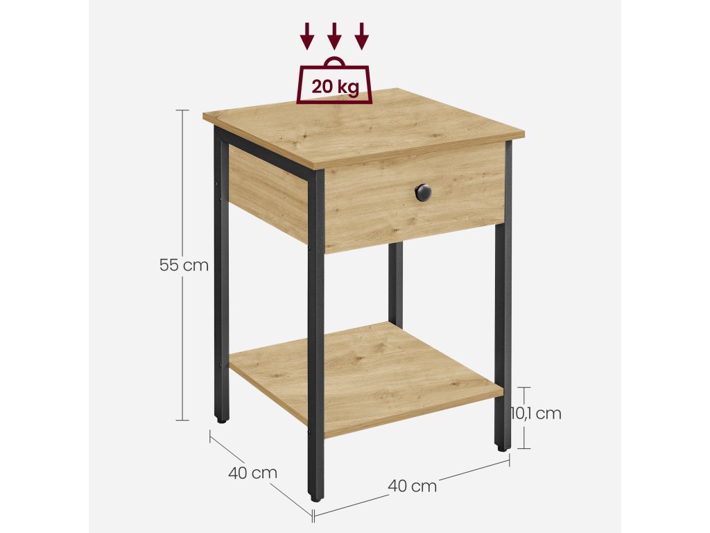 A felső rész ideális helyet kínál lámpának, könyvnek, mobiltelefonnak vagy dekorációknak. A praktikus fiók lehetővé teszi olyan apró tárgyak tárolását, amelyeket kéznél, de mégis szem elől rejtve szeretne tartani. Az alsó nyitott polc ideális könyvek, magazinok vagy tárolódobozok számára.