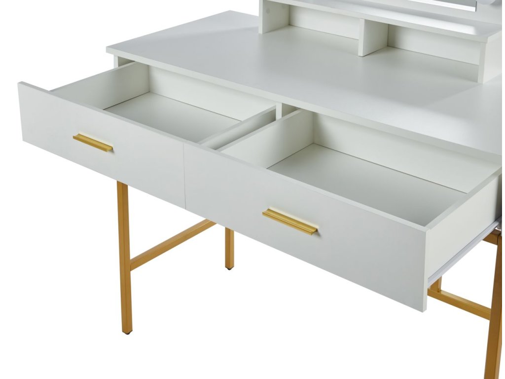 Az arany bevonatú, stabil fémszerkezet könnyedséget és szilárdságot kölcsönöz az asztalnak, míg a fehér laminált asztallap könnyen karbantartható és ellenáll a rendszeres használatnak. A LUMIÈRE GOLD fésülködőasztal nemcsak funkcionális bútordarab lesz, hanem a hálószobád vagy a gardróbod jellegzetes designeleme is.