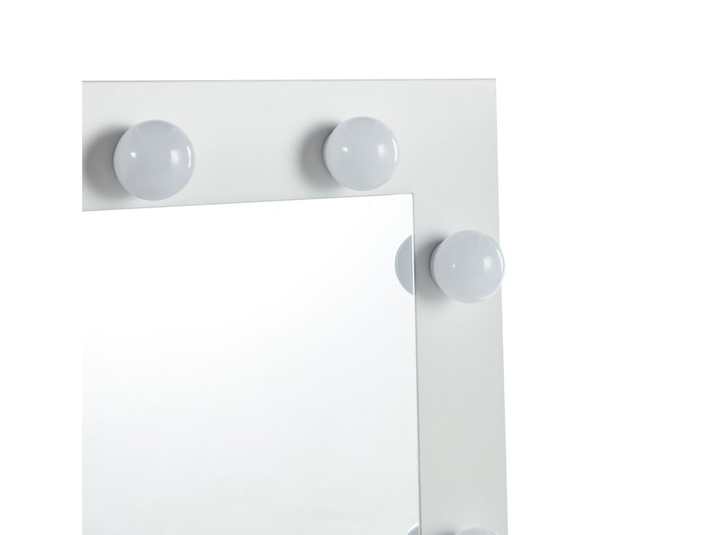 Az asztalt egy nagyméretű, beépített LED-világítással ellátott tükör uralja, amely egyenletes és kellemes fényt biztosít a precíz sminkeléshez, hajformázáshoz vagy bőrápoláshoz. A praktikus felső polc és a két fiók rengeteg helyet kínál a kozmetikumok, ékszerek és kiegészítők számára, így minden kéznél van.