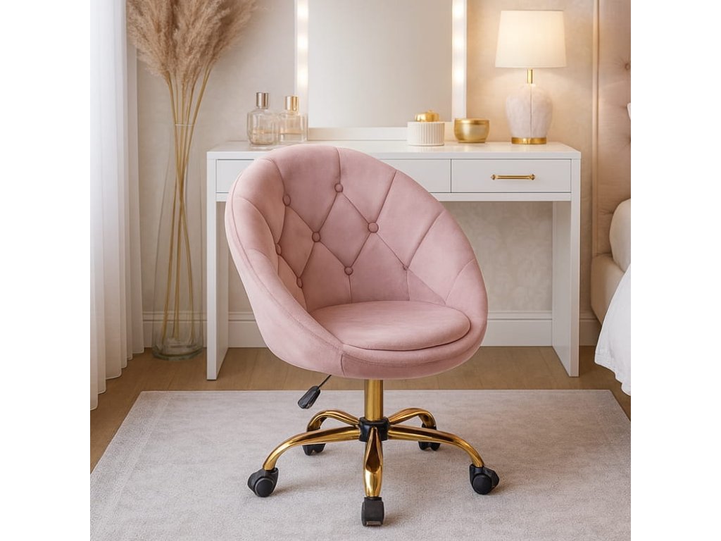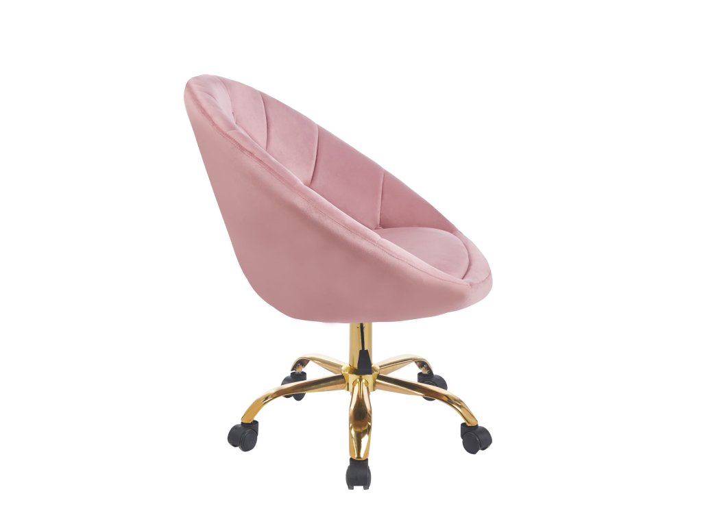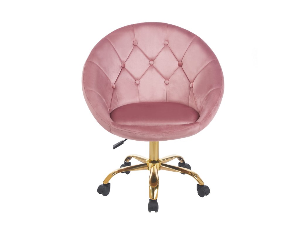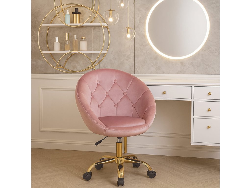Stílusos forgószék modern dizájnnal és puha rózsaszín kárpitozással. Kényelmes, stabil és ideális nappaliba, hálószobába vagy irodába.