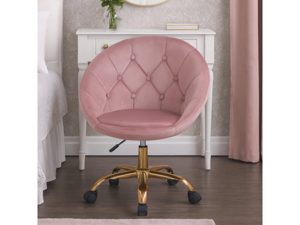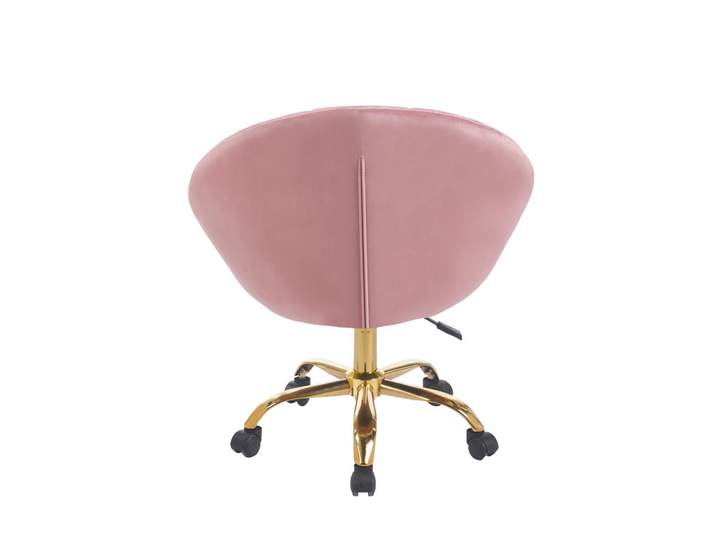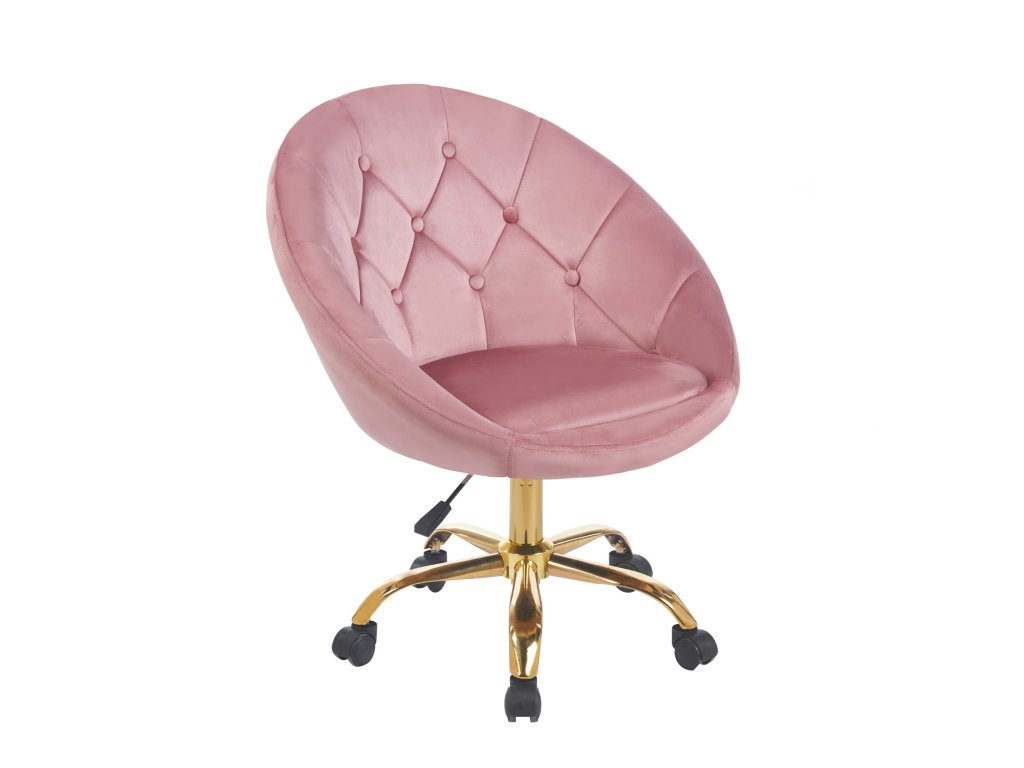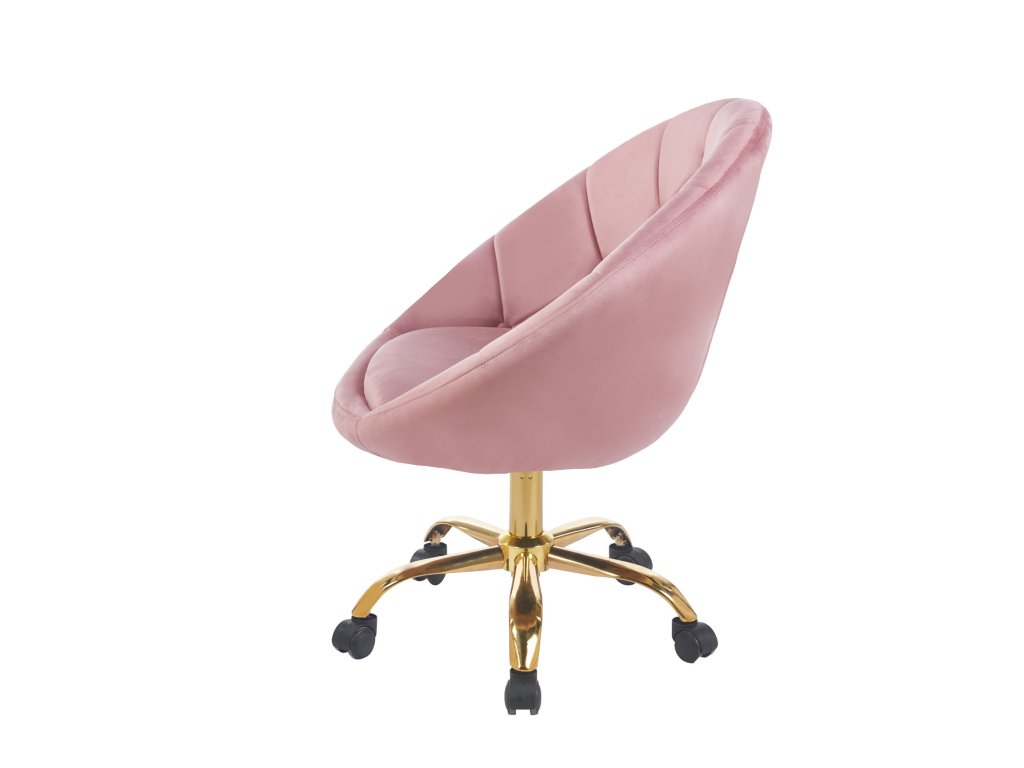 Stílusos forgószék modern dizájnnal és puha rózsaszín kárpitozással. Kényelmes, stabil és ideális nappaliba, hálószobába vagy irodába.