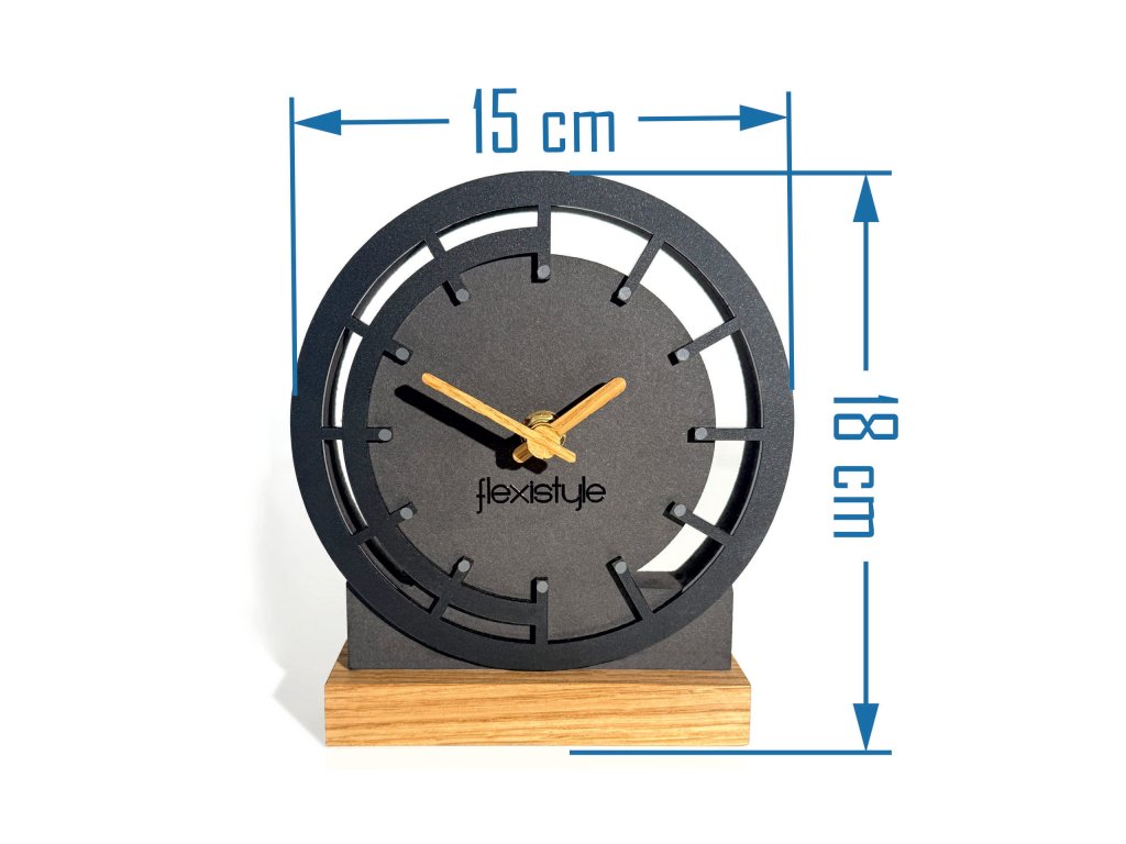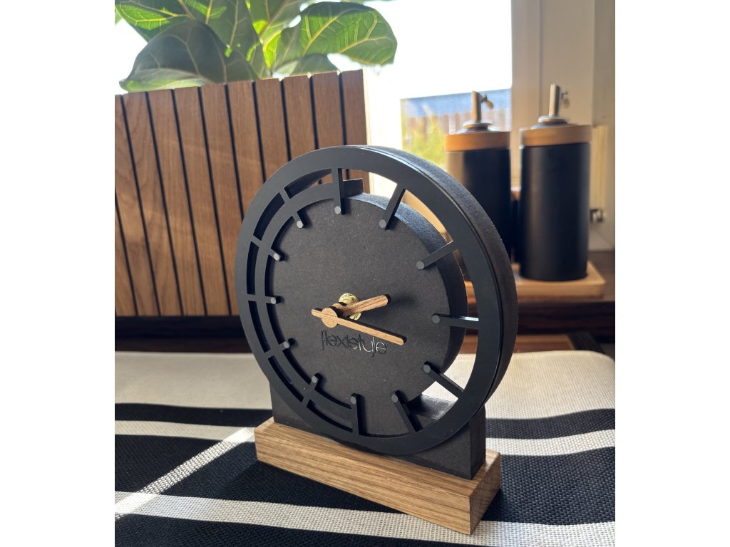 A Black Oak 2 asztali óra ideális termék egy komódra, konzolra vagy polcra. Az alapjuk természetes tölgyfából készült, ami karaktert és eleganciát ad nekik. A tölgy furnér kezek tökéletesen illeszkednek az állványhoz és a tölgy díszítőelemekhez. A fekete MDF és tölgyfa kombinációja eleganciát és környezetbarát érzetet kölcsönöz ennek az órának.