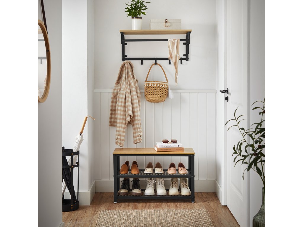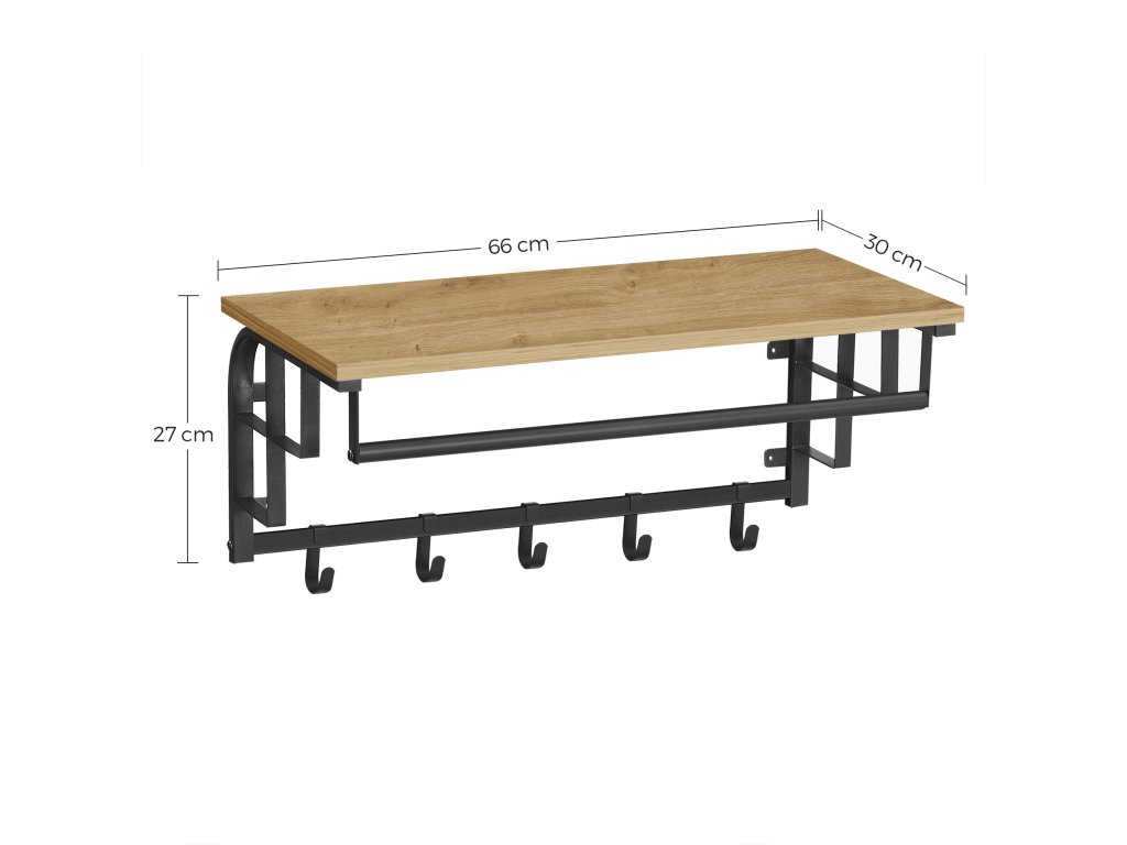 A felső polc rengeteg helyet biztosít dekorációknak, növényeknek, könyveknek vagy tárolódobozoknak. Az alsó fémrúd és a csúszóhorgok rugalmas megoldást kínálnak kabátok, táskák, kulcsok, sálak vagy konyhai kiegészítők felakasztására. A horgok szabad csúszóképességének köszönhetően könnyen a saját igényeidhez igazíthatod az elrendezést.