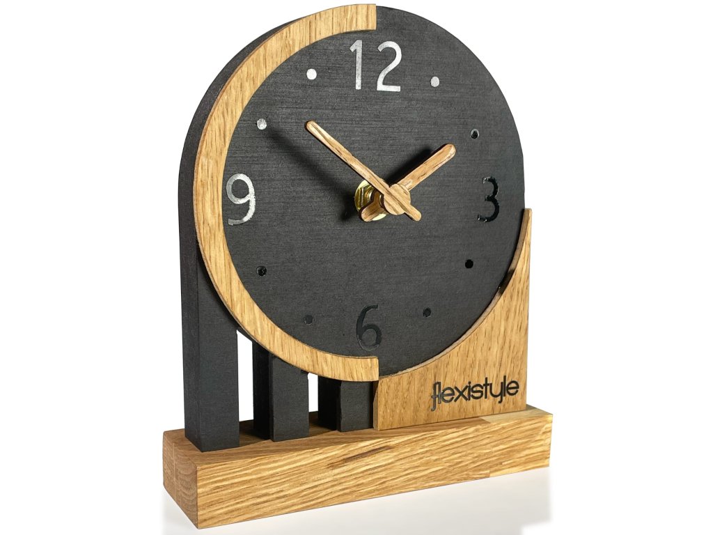 A Black Oak asztali óra ideális termék egy komódra, konzolra vagy polcra. Az alapjuk természetes tölgyfából készült, ami karaktert és eleganciát ad nekik. A tölgy furnér kezek tökéletesen illeszkednek az állványhoz és a tölgy díszítőelemekhez. A fekete MDF és tölgyfa kombinációja eleganciát és környezetbarát érzetet kölcsönöz ennek az órának.