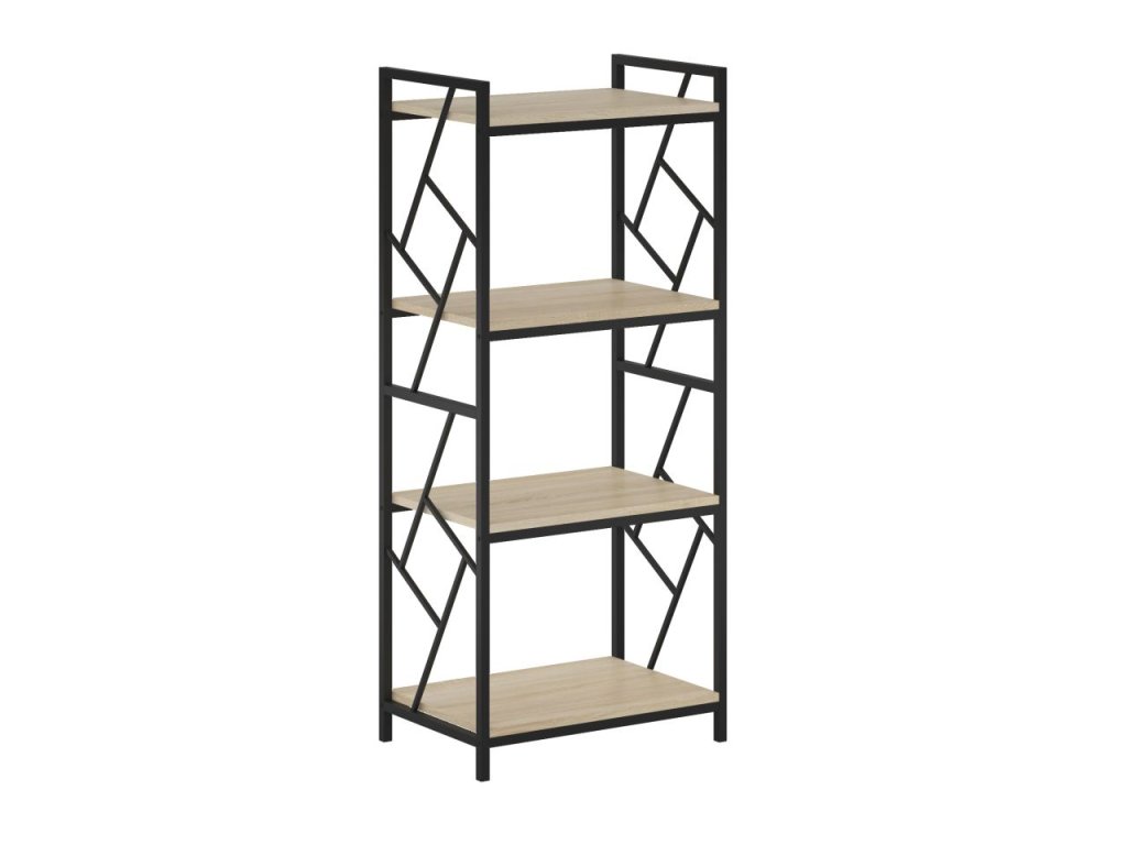 A modern R2-FX könyvespolc kellemes Sonoma Oak dekorral ötvözi az elegáns megjelenést a praktikus funkcionalitással. A fekete fém szerkezet ipari jelleget kölcsönöz az egész bútornak, míg a laminált forgácslapból készült világos polcok kellemes kontrasztot alkotnak.