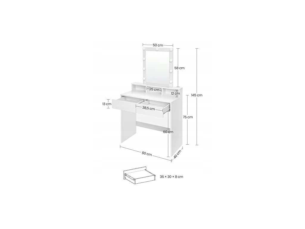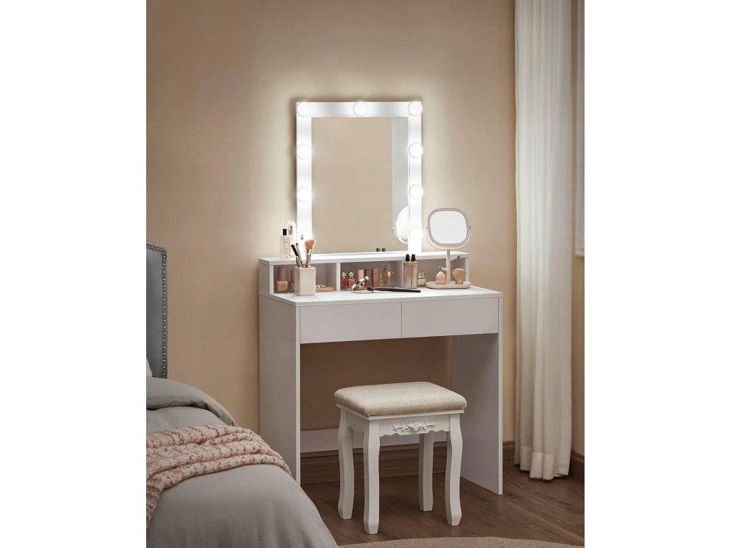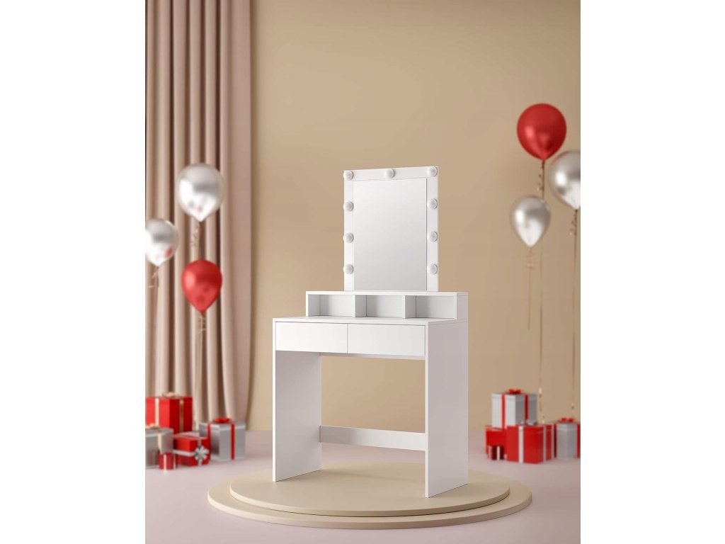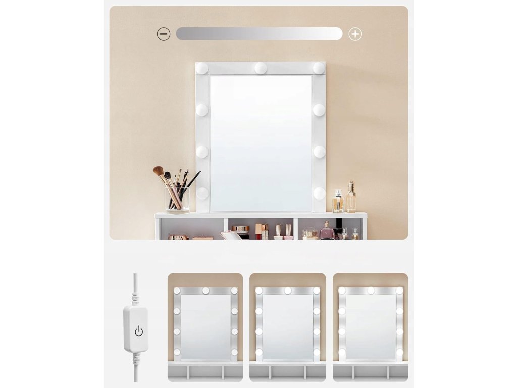 Az asztal 9 LED izzóval van felszerelve, amelyek egyenletesen megvilágítják az arcot, és megkönnyítik a precíz sminkelést vagy bőrápolást. A fény intenzitását is szükség szerint állíthatod - a lágy háttérvilágítástól az erős fényig, ami ideális a részletes munkához.
