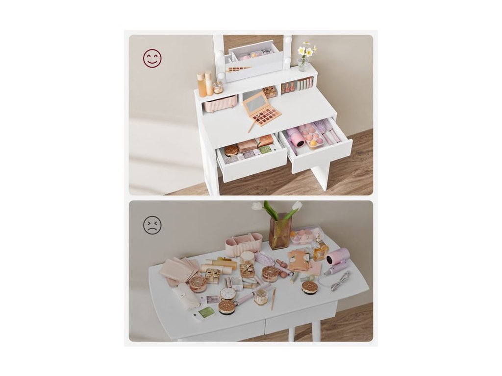 Az öltözőasztal rengeteg helyet biztosít az összes kozmetikai kincs rendszerezéséhez: