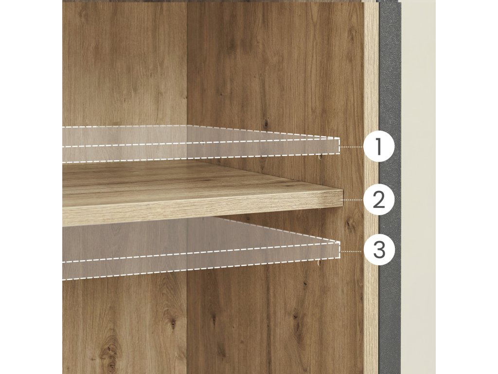 A tolóajtók helyet takarítanak meg, és kényelmes hozzáférést biztosítanak a tárolóhelyhez még kisebb helyiségekben is. A magasságban állítható belső polcok lehetőséget adnak arra, hogy a tárolóhelyet az igényeidhez igazítsd – legyen szó dokumentumokról, könyvekről, dekorációkról vagy lakberendezési kiegészítőkről. A nyitott polc ideális a kedvenc tárgyaid bemutatására.