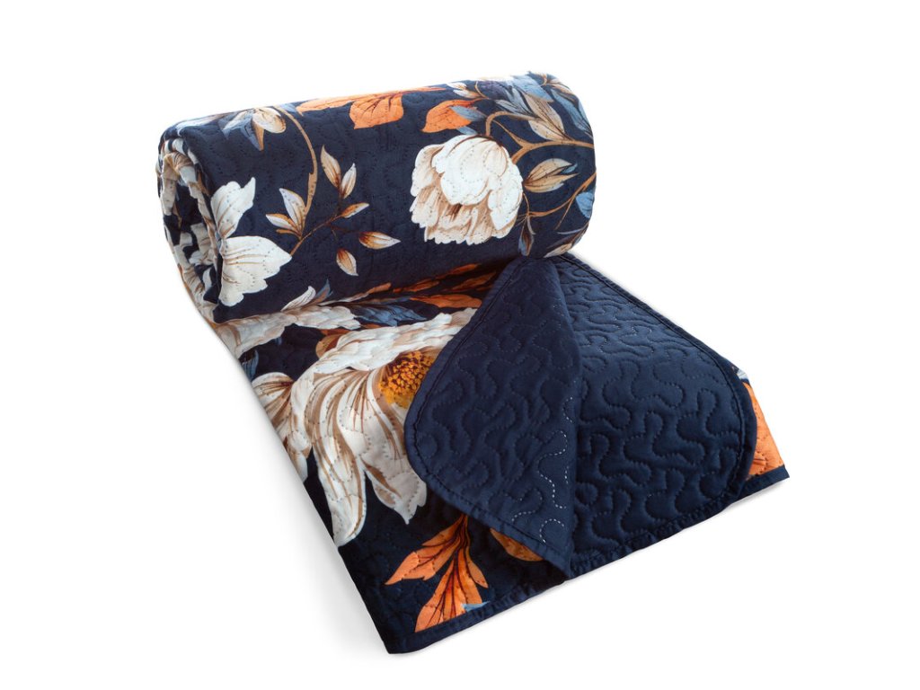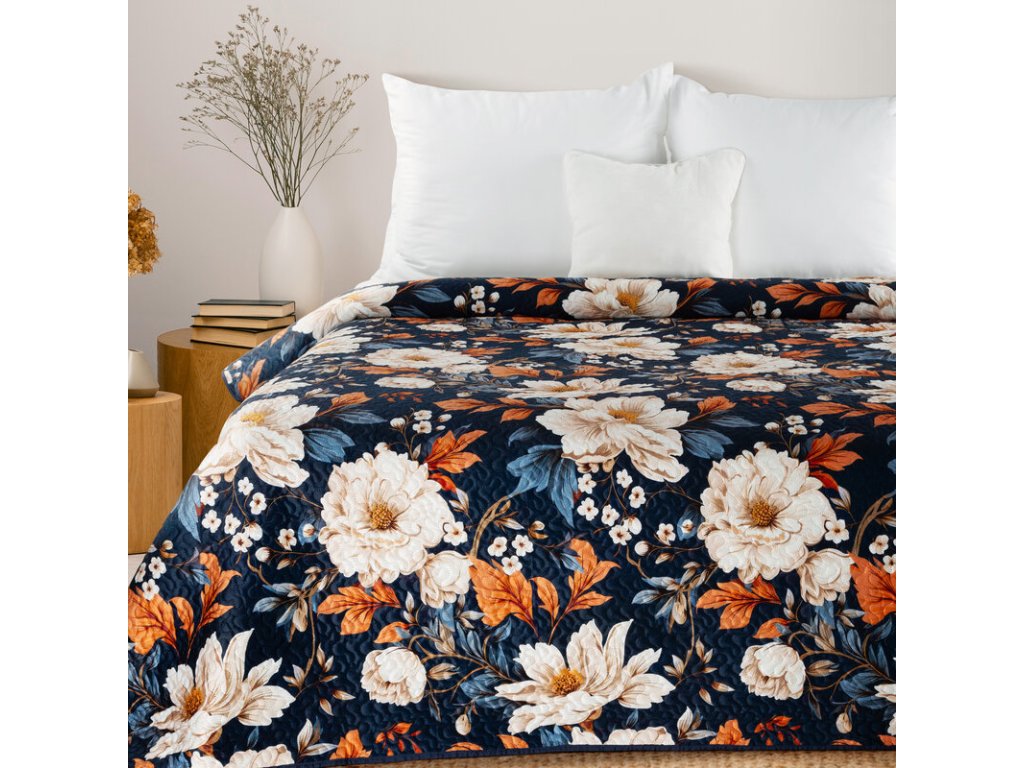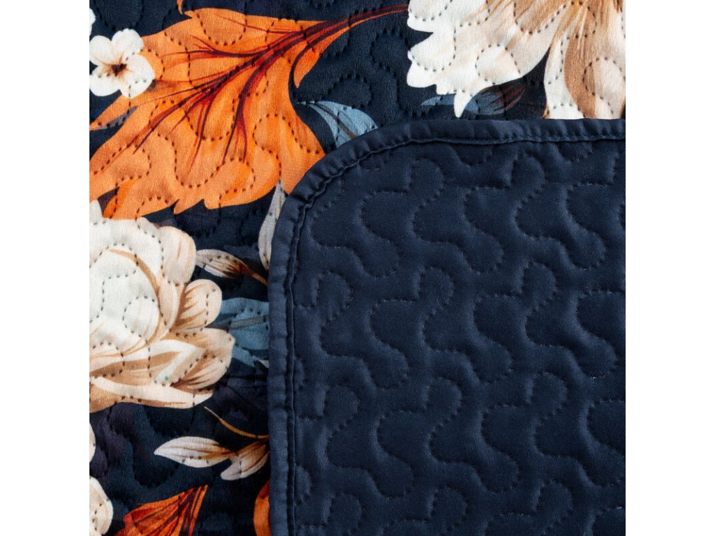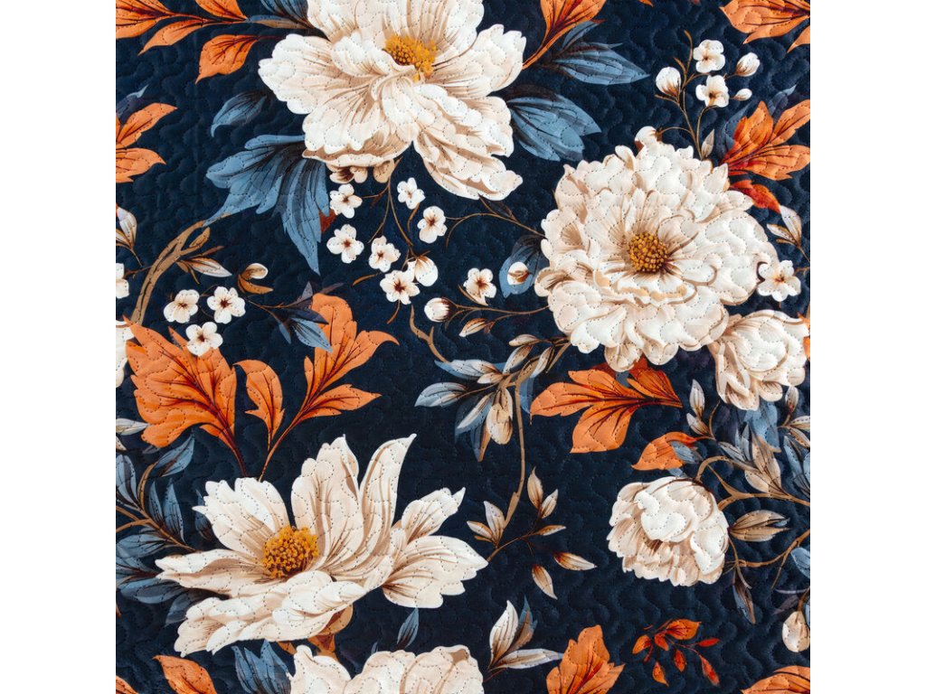 A gazdag virágminta meleg narancssárga és lágy fehér tónusok kombinációjában, sötétkék alapon, modern és egyszerre otthonos hatást kelt.