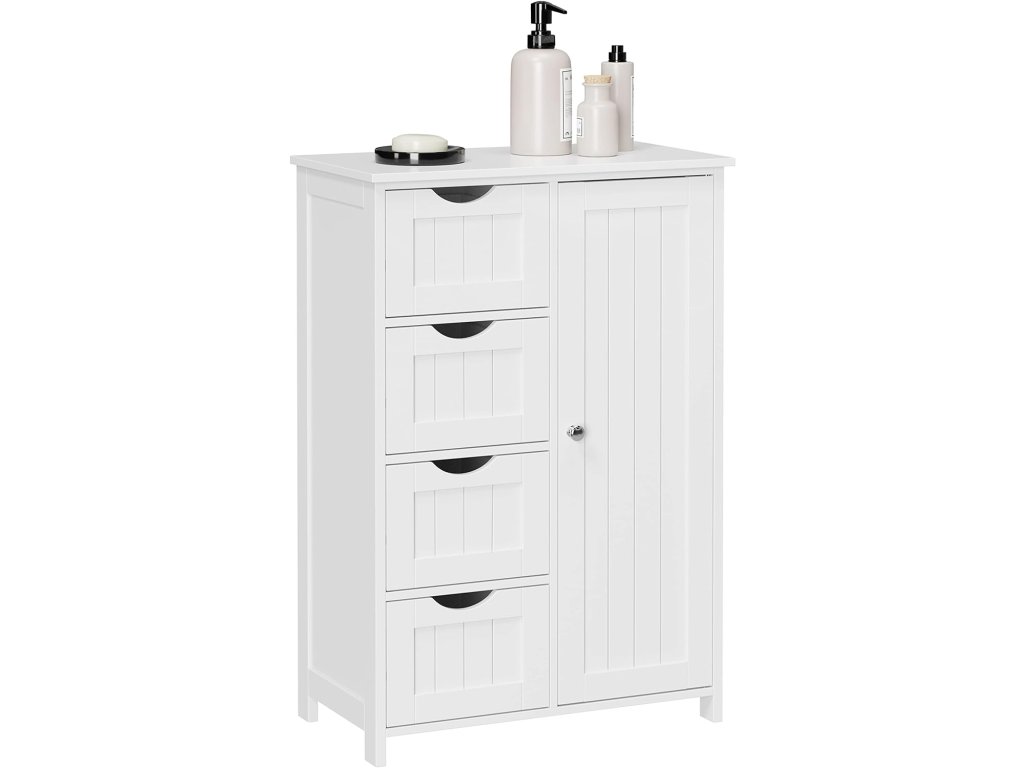 Az elegáns , fehér színű fürdőszobaszekrény - fiókos komód praktikus megoldás mindazok számára, akik rendben szeretnék tartani fürdőszobájukat, miközben tiszta, modern belső megjelenést szeretnének fenntartani. A zárható tárolóhely és a négy fiók kombinációjának köszönhetően elegendő helyet biztosít törölközők, kozmetikumok, higiéniai kellékek és fürdőszobai kiegészítők tárolására.