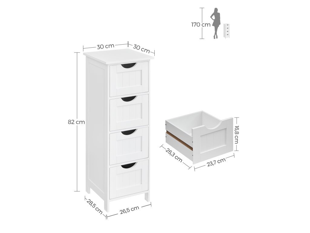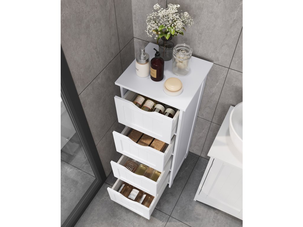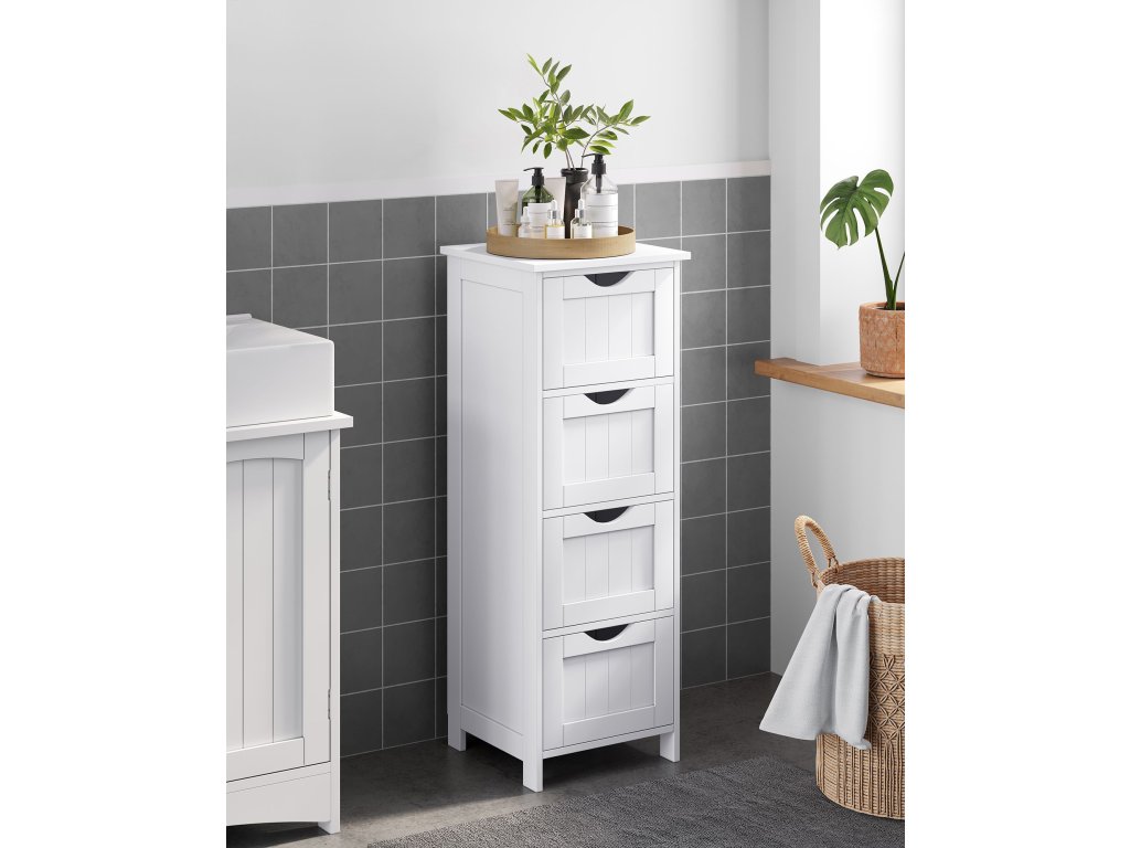 Ez a modern , 4 fiókos, fehér színű fürdőszobaszekrény praktikus és elegáns megoldást kínál a fürdőszoba és az otthon egyéb helyiségeinek rendszerezésére. Keskeny és magas kialakításának köszönhetően kisebb helyiségekbe is tökéletes, ahol fontos minden centiméter kihasználása.