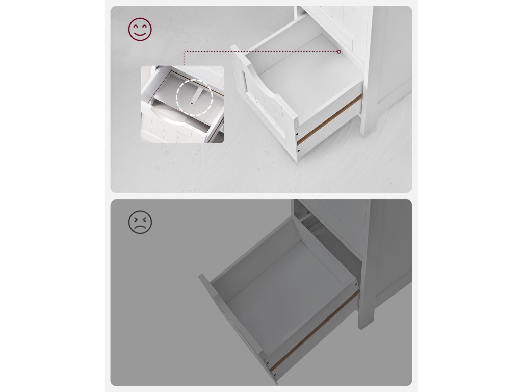 A szekrény négy tágas fiókkal rendelkezik, amelyek lehetővé teszik a kozmetikumok, törölközők, tisztítószerek vagy fürdőszobai kiegészítők áttekinthető tárolását. A modern dizájnt függőleges marás és praktikus, kivágások formájában elhelyezett fogantyúk hangsúlyozzák, amelyek kényelmes nyitást és letisztult, minimalista megjelenést biztosítanak.