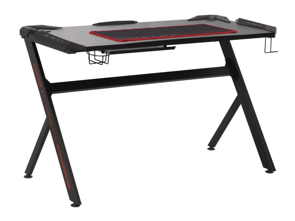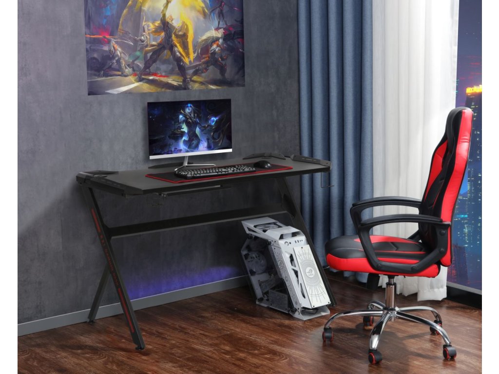 Modern fekete és piros színű gamer asztal, amely a stílusos dizájnt ötvözi a praktikus funkciókkal minden játékos számára. Az asztal felülete szénszálas imitációjú laminált anyaggal van bevonva, amely prémium, sportos megjelenést kölcsönöz a terméknek. A porszórt fémszerkezet hosszú távú stabilitást és tartósságot biztosít.