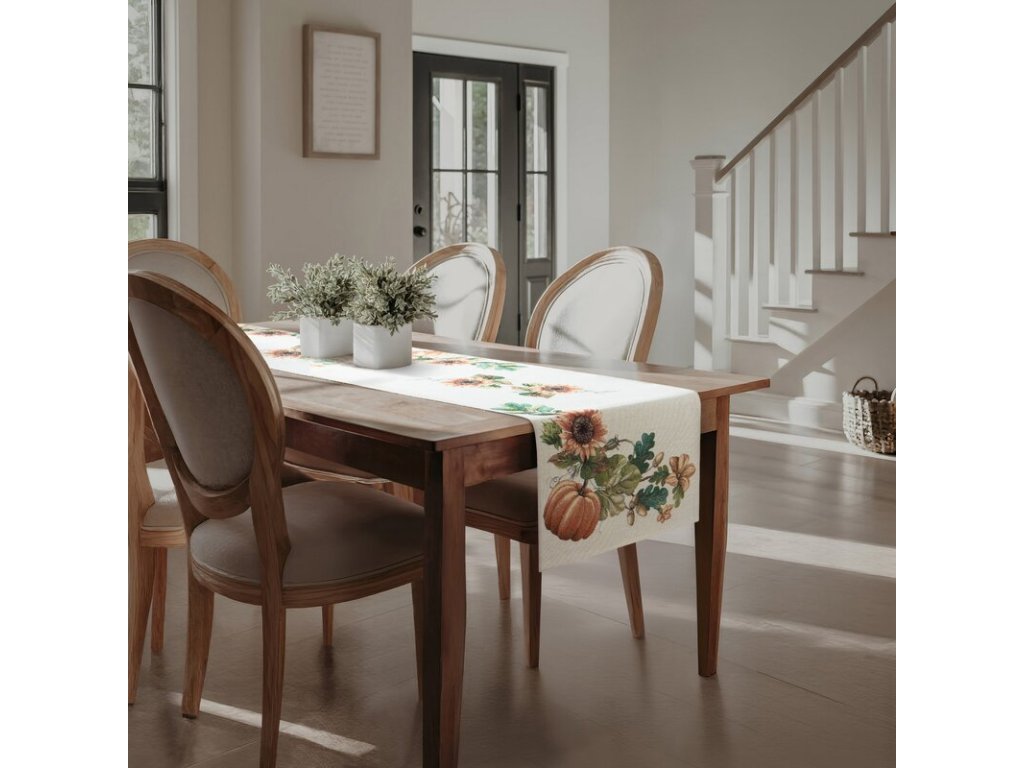 A vastag gobelin anyagból, finom zsenília szállal díszített, őszi mintával díszített asztali futó a retró stílust idézi.