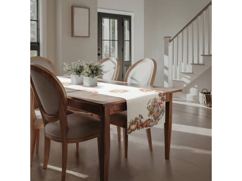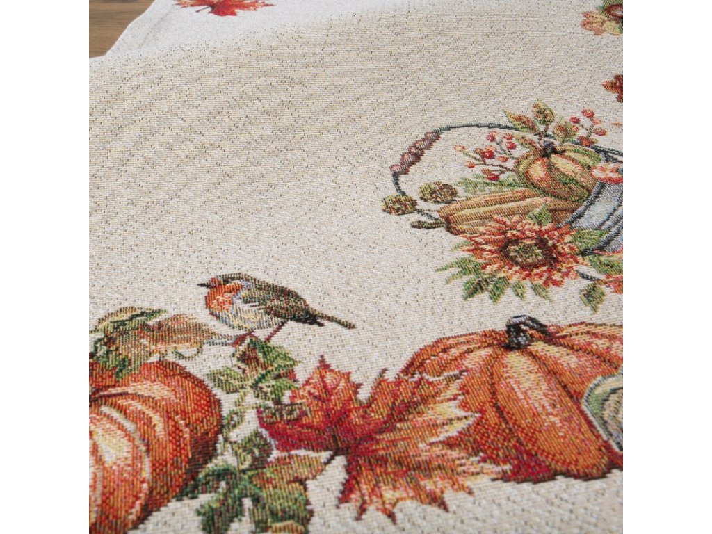 A vastag gobelin anyagból, finom zsenília szállal díszített, őszi mintával díszített asztali futó a retró stílust idézi.