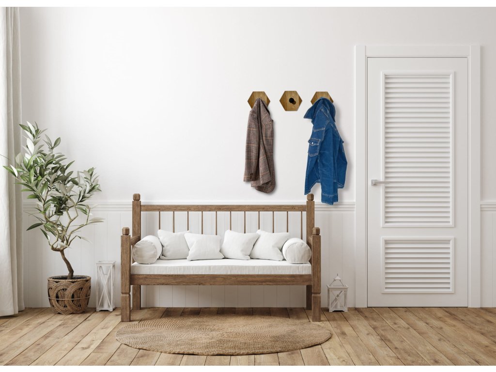 Minimalista és elegáns fali akasztó szabályos hatszög formájában, tömör tölgyfából.