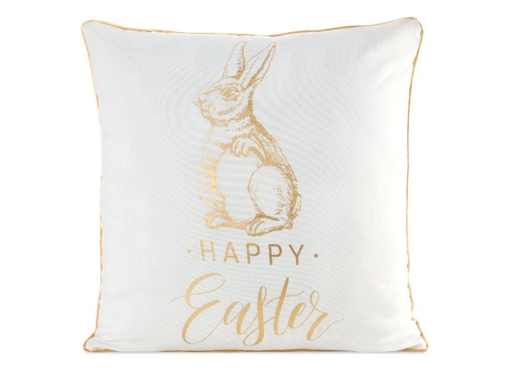 Elegantná veľkonočná obliečka na vankúš z kvalitného polyesteru, zdobená zlatým nápisom ,, Happy Easter" a štylizovaným motívom zajaca.