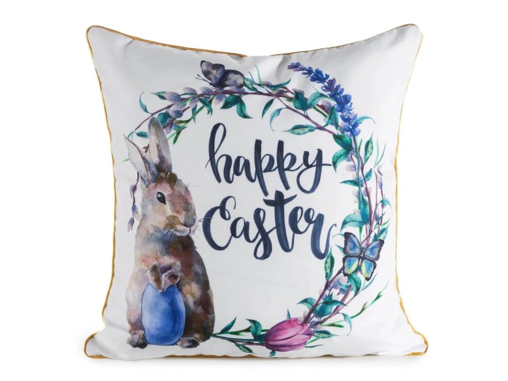 Elegantná veľkonočná obliečka na vankúš z kvalitného polyesteru, zdobená potlačou venca so zajčikom a nápisom : Happy Easter.