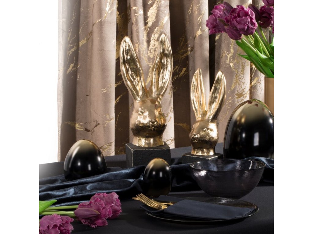 Stílusos és elegáns húsvéti nyuszi figura, kiváló minőségű kerámia agyagból. Egyedi dizájnját jellegzetes díszítések hangsúlyozzák, amelyek modern és luxus jelleget kölcsönöznek a dekorációnak.