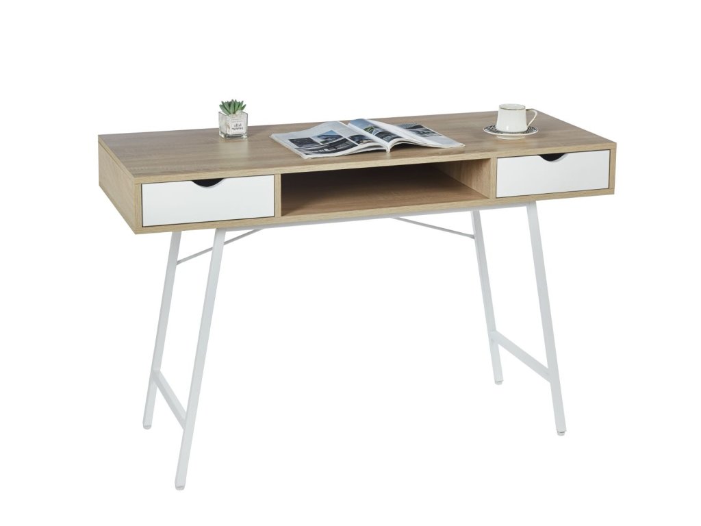 102x77x41 cm-es méreteivel elegendő munkafelületet biztosít egy laptopnak, dokumentumoknak és irodaszereknek. Két praktikus fiók és egy nyitott polc hatékony tárolási megoldást kínál a munkaterület rendszerezéséhez és az asztal rendben tartásához.