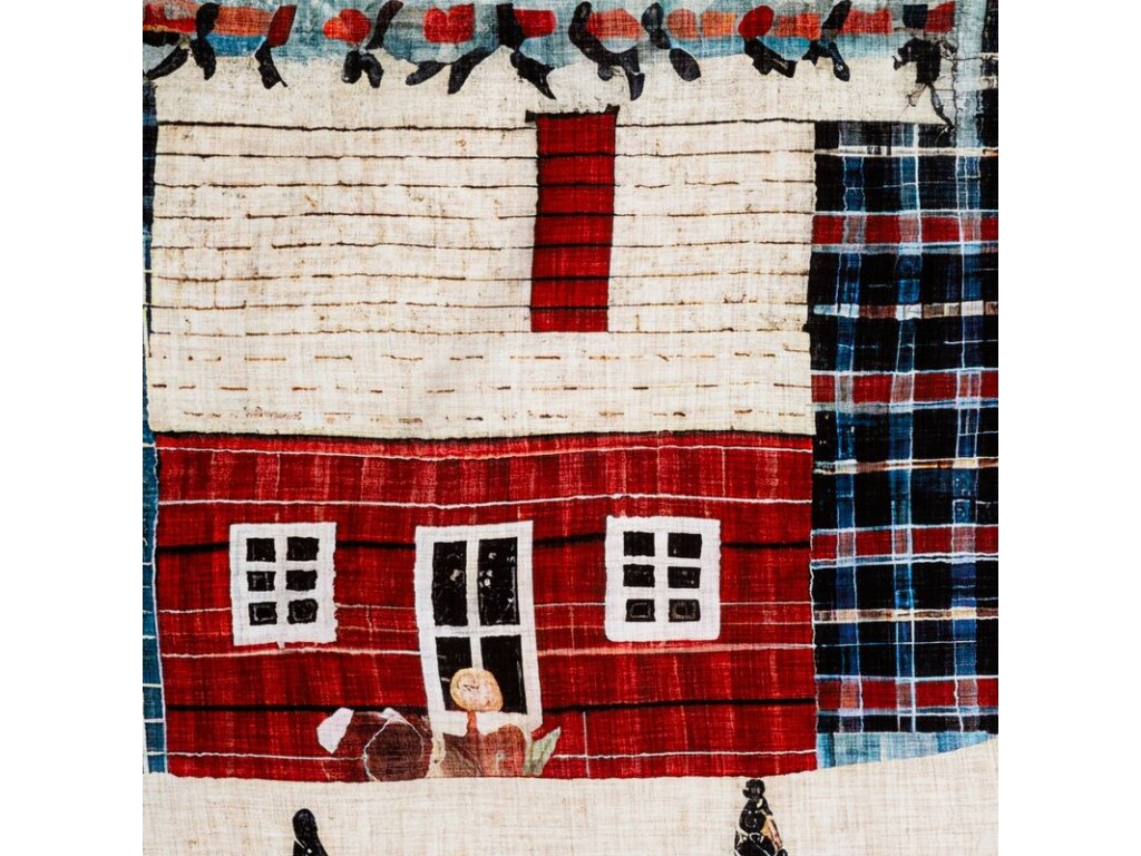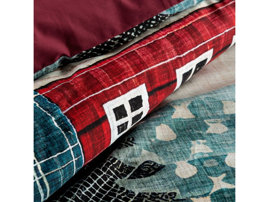 A felső oldalát egy téli falu finom mintája díszíti, az alsó oldal egyszínű, minta nélkül.