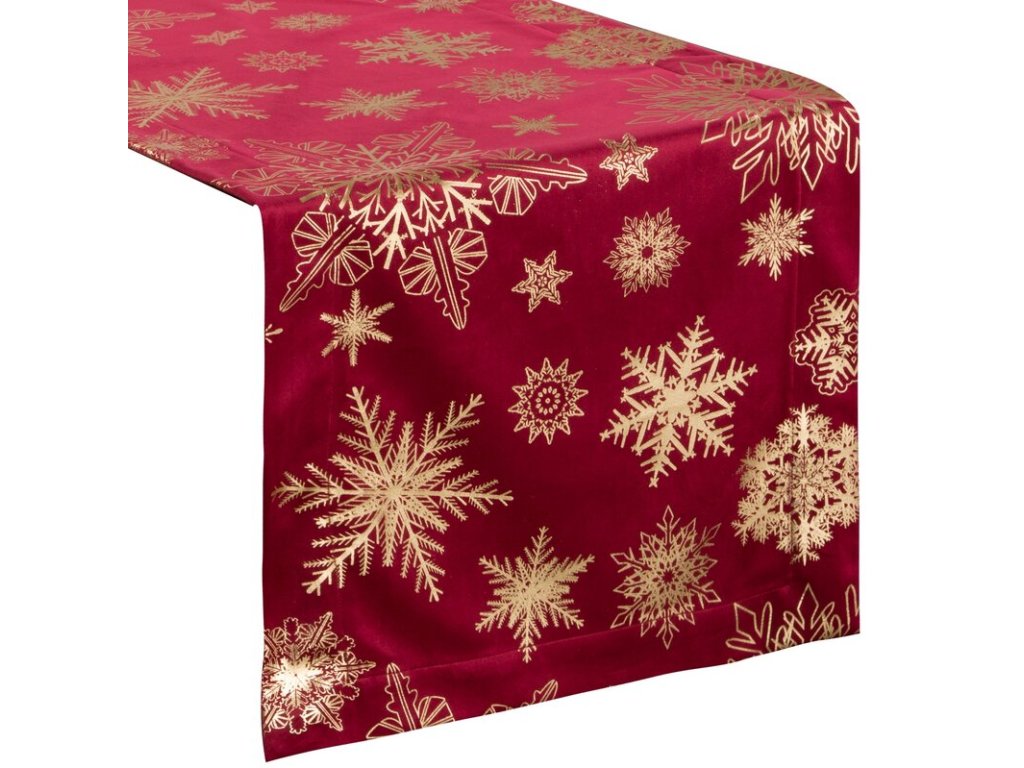 Egy ünnepi, bársonyos, dekoratív futószalag fényes hópehely mintával tökéletes kiegészítője lesz karácsonyi asztalának.