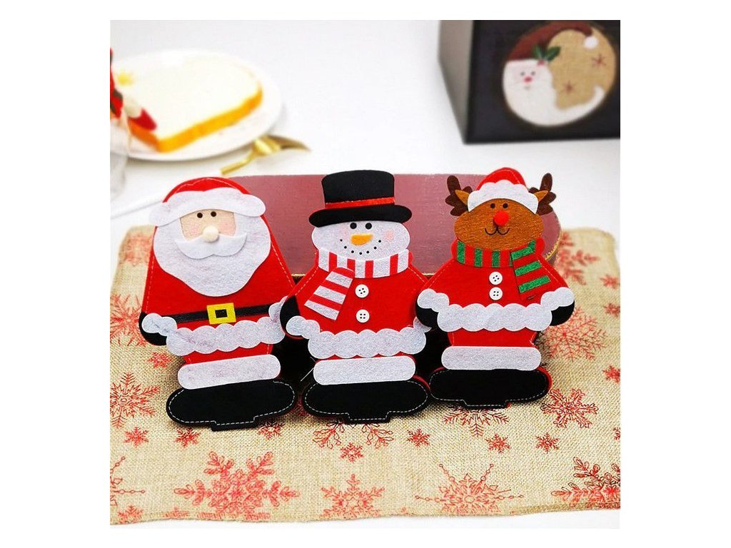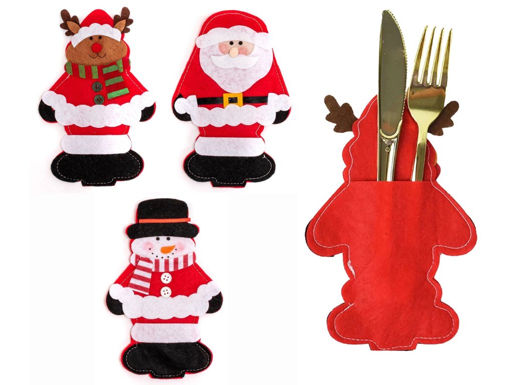 Gyönyörű piros evőeszközhuzatok rénszarvas, Mikulás és hóember motívumokkal.
