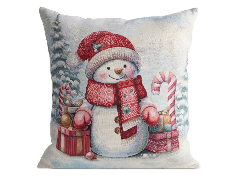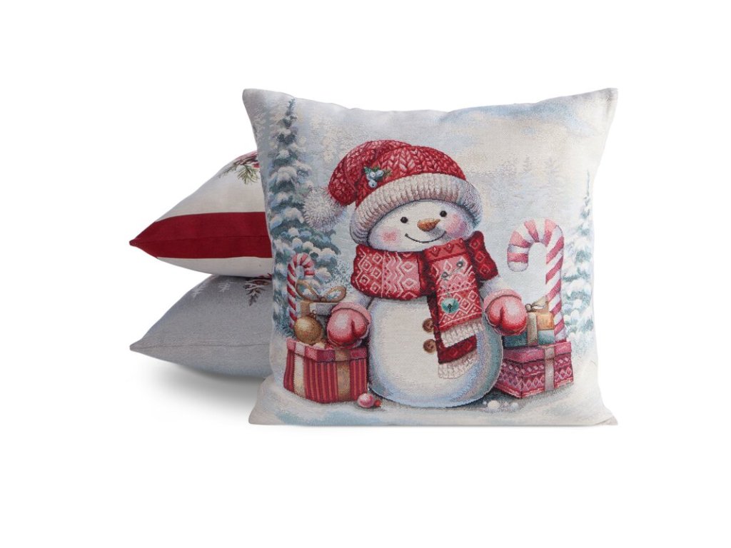 Karácsonyi gobelin párnahuzat - Hóember ajándékokkal