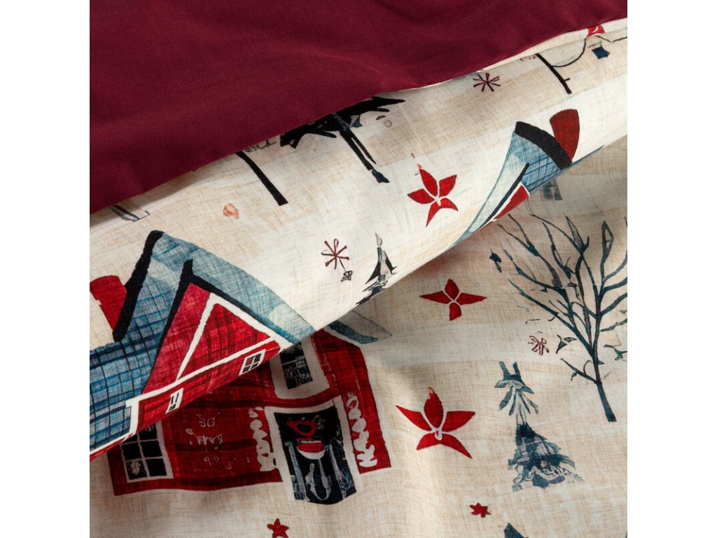 A felső oldalát egy téli falu finom mintája díszíti, az alsó oldal egyszínű, minta nélkül.