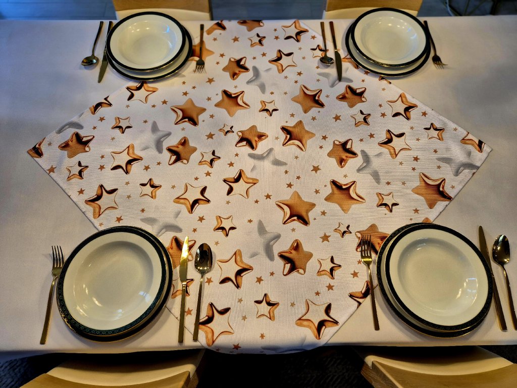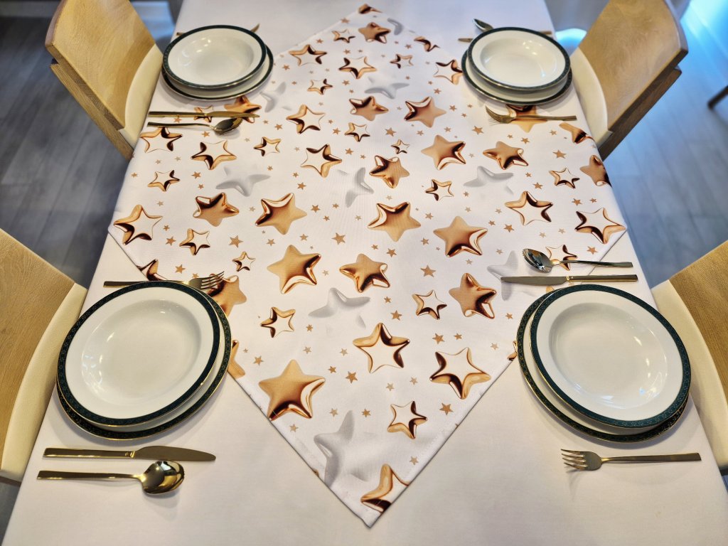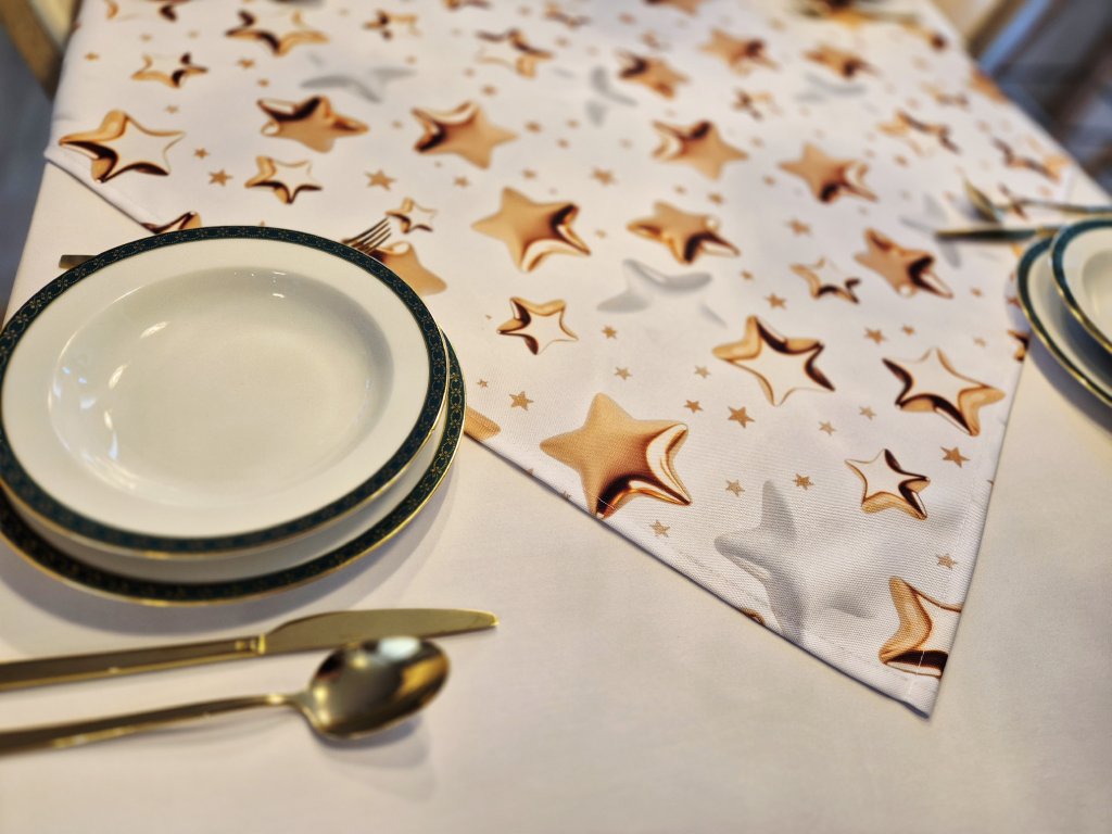 Varázsolj igazi ünnepi hangulatot otthonodba ezzel a bájos, csillag mintás karácsonyi terítővel.