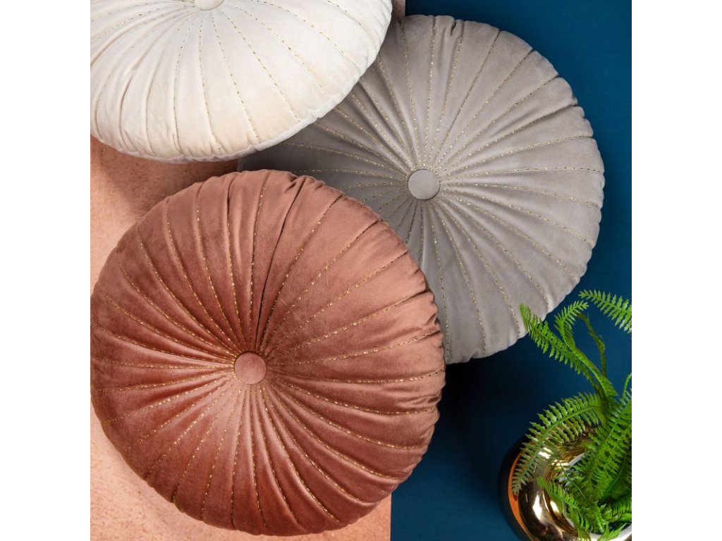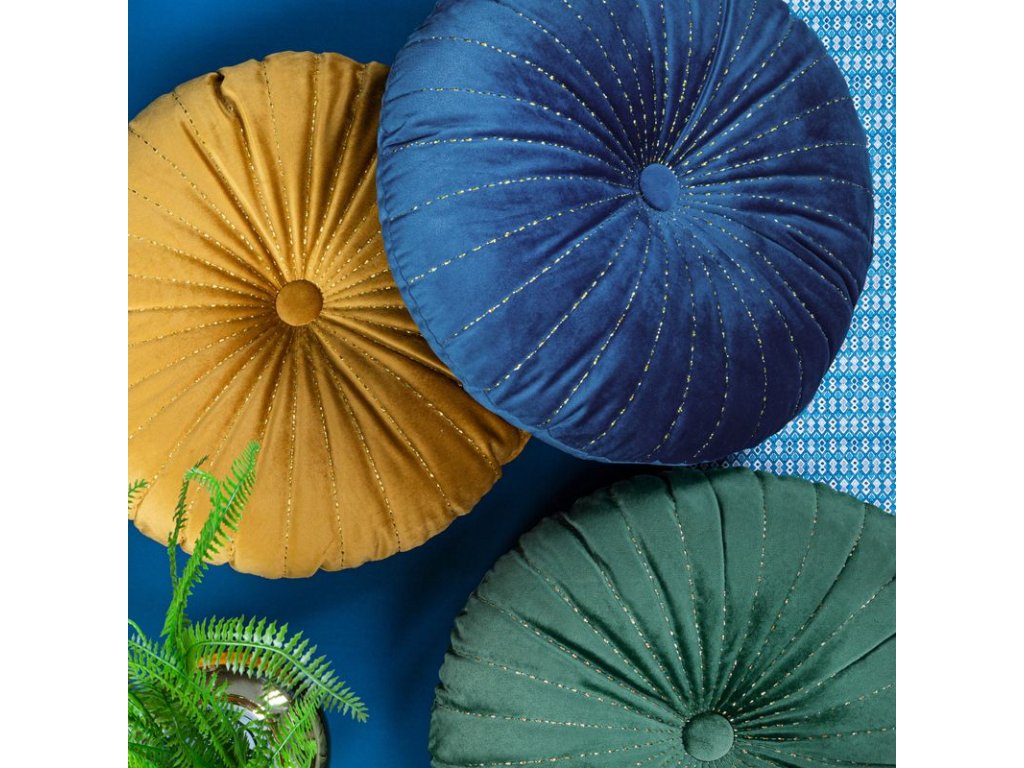 A VELVET kollekció divatos párna kerek formájával, puha fényű, puha bársony anyagával és aranyszálas varrásával tűnik ki.