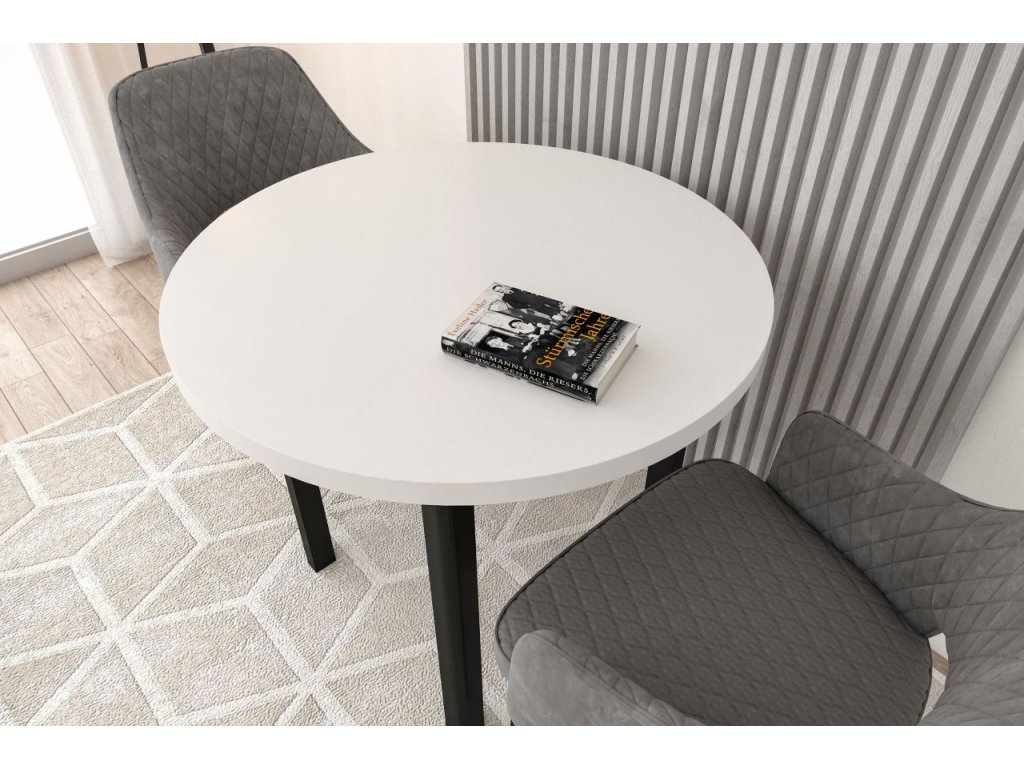 Ez a modern, kerek étkezőasztal időtlen kombinációjában tiszta fehér asztallappal és fekete lábakkal tökéletes megoldás a minimalista, skandináv vagy ipari stílus kedvelőinek. A kontrasztos színek kombinációja eleganciát, frissességet és vizuális könnyedséget kölcsönöz a belső térnek.
