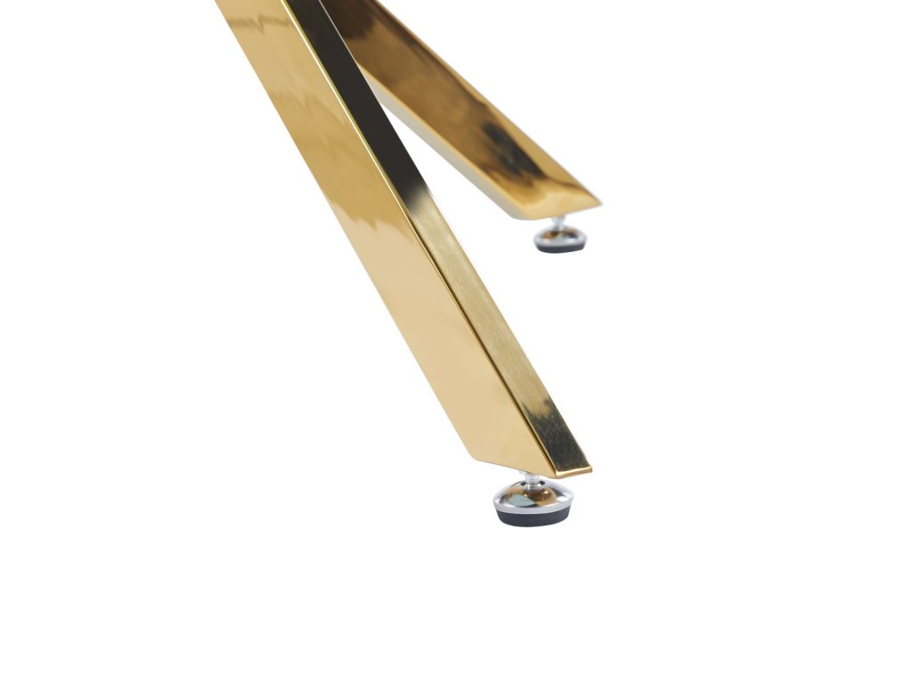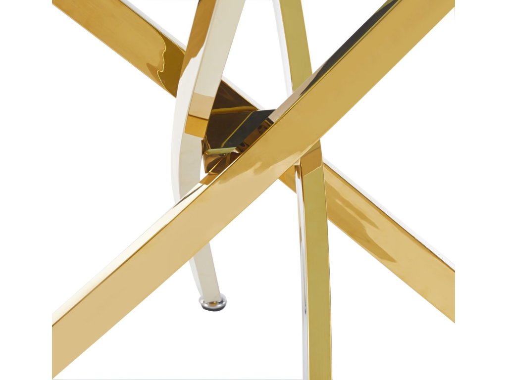 A teteje kiváló minőségű edzett üvegből készült, amely tartós, könnyen karbantartható és egyben rendkívül stílusos is. A fehér márványdekor mélységet és jellegzetes vizuális hatást kölcsönöz az asztallapnak. A stabil alapot krómozott, arany színű acéllábak alkotják, amelyek modern, keresztezett kialakítása kivételes megjelenést és nagyfokú stabilitást kölcsönöz az asztalnak.