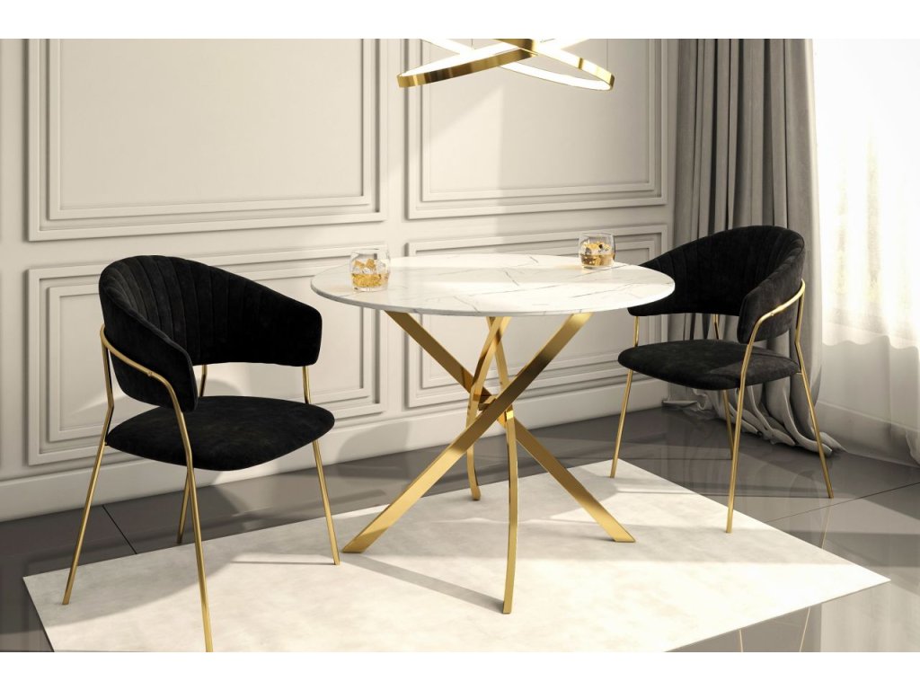 Ez a luxus kerek étkezőasztal a fehér márványhatás és az arany fém lábak vonzó kombinációjával tökéletes kiegészítője a modern, elbűvölő és elegáns belső tereknek. Jellegzetes kialakításának köszönhetően étkezője vagy konyhája fénypontjává válik, luxust és exkluzivitást kölcsönözve a térnek.