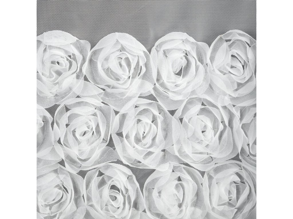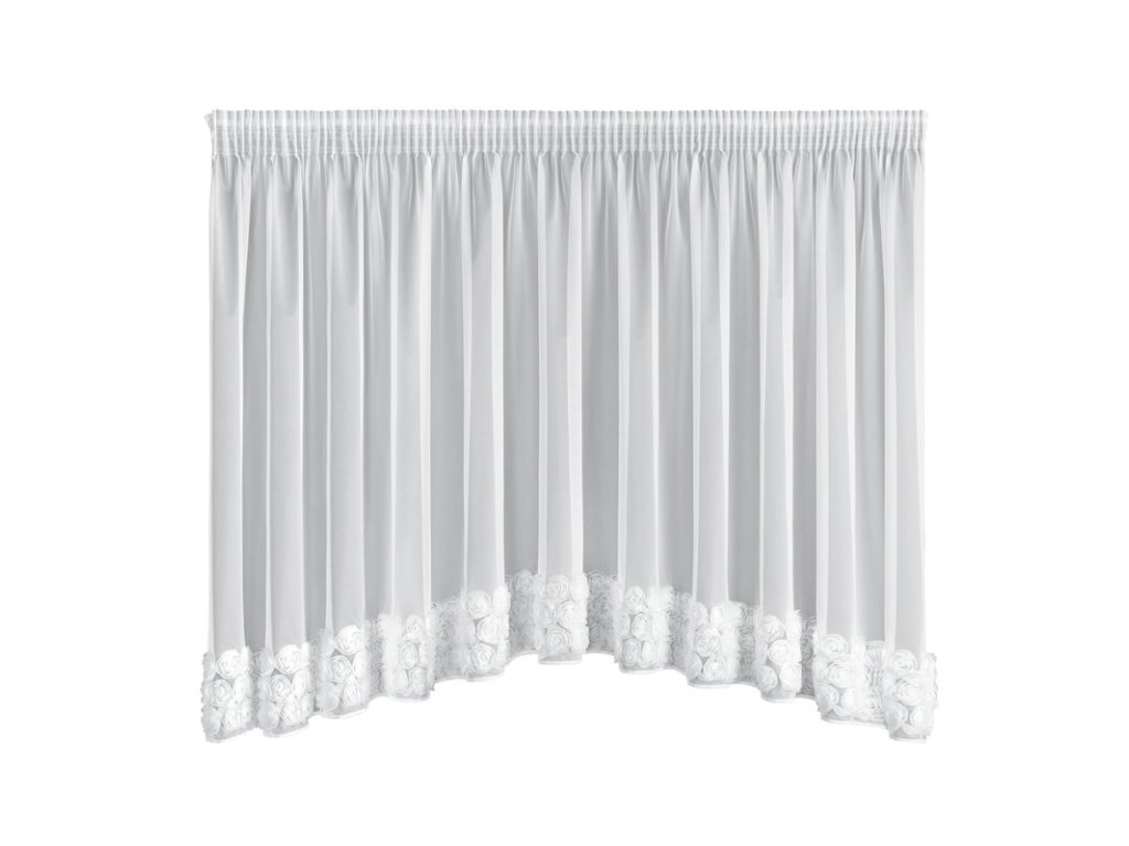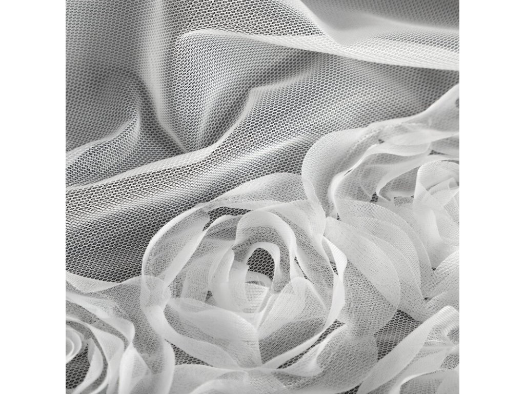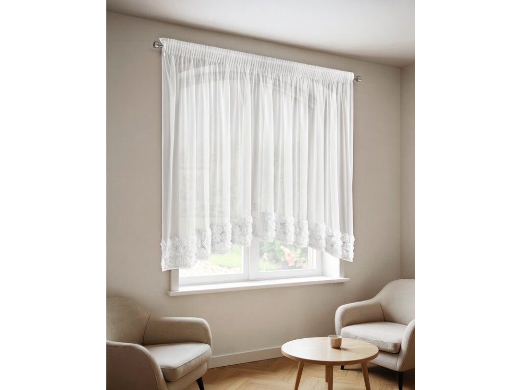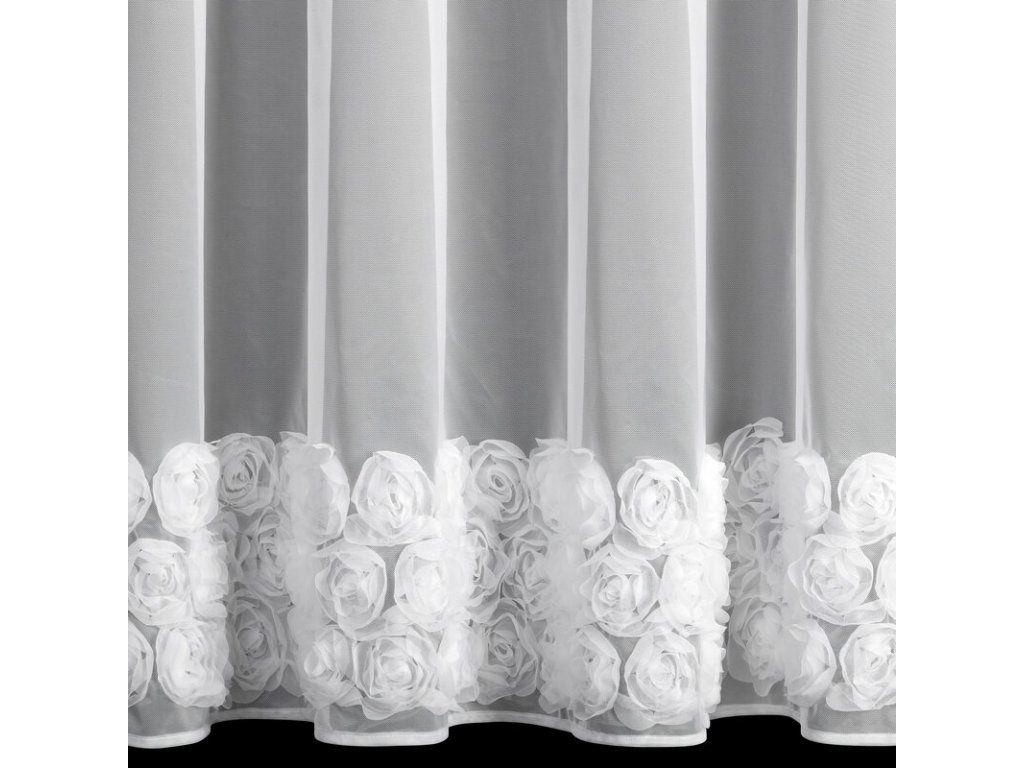 Egy finom , könnyű hálóból készült, kész függöny ideális választás azok számára, akik szeretik a romantikus és dekoratív kiegészítőket az enteriőrbe. A függöny alsó szélét háromdimenziós, 3D-s rózsák íve díszíti, amelyeket precízen varrtak az anyagból, és kivételes kecsességet, nőiességet és bájt kölcsönöznek a szobának.