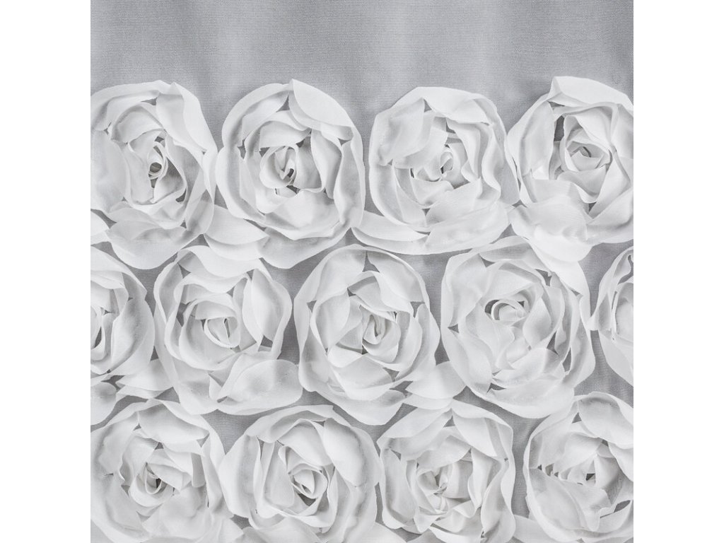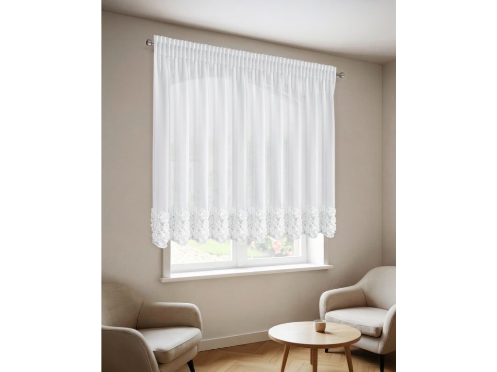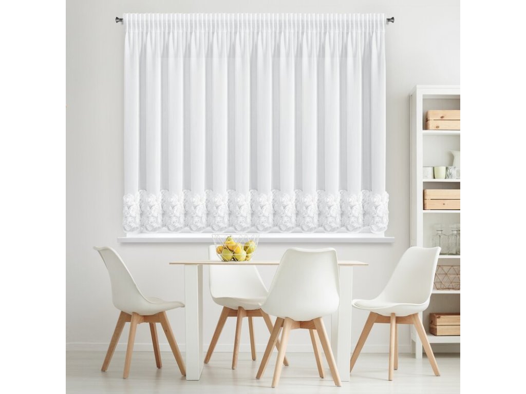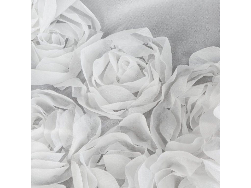 A függönyt három vízszintes, 3D-s szövetrózsa csík díszíti, amelyek gyönyörű dekoratív hatást keltenek, és romantikus, nőies jelleget kölcsönöznek a belső térnek. A finom voile és az érzéki részletek kombinációja ideális kiegészítője a hálószobának, a nappalinak vagy az étkezőnek , ahol harmónia és elegancia légkörét teremti meg.