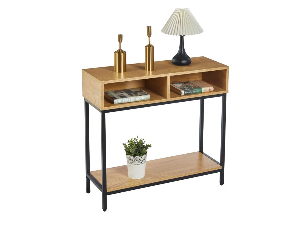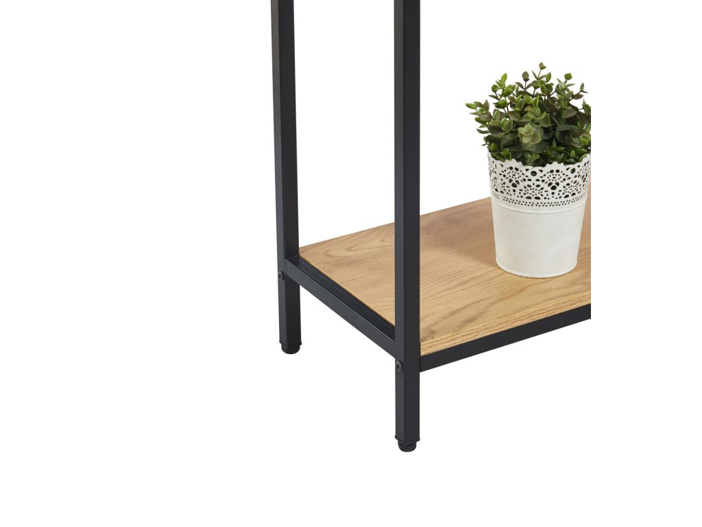 Két nyitott polc praktikus helyet kínál dekorációknak, kosaraknak, könyveknek vagy apróságoknak, amelyeket kéznél szeretne tartani. A fa és a fém letisztult vonalai és kontrasztja luxus, letisztult hangulatot teremt – pont olyan kiegészítő, amely „dizájnjegyet” ad egy belső térnek.