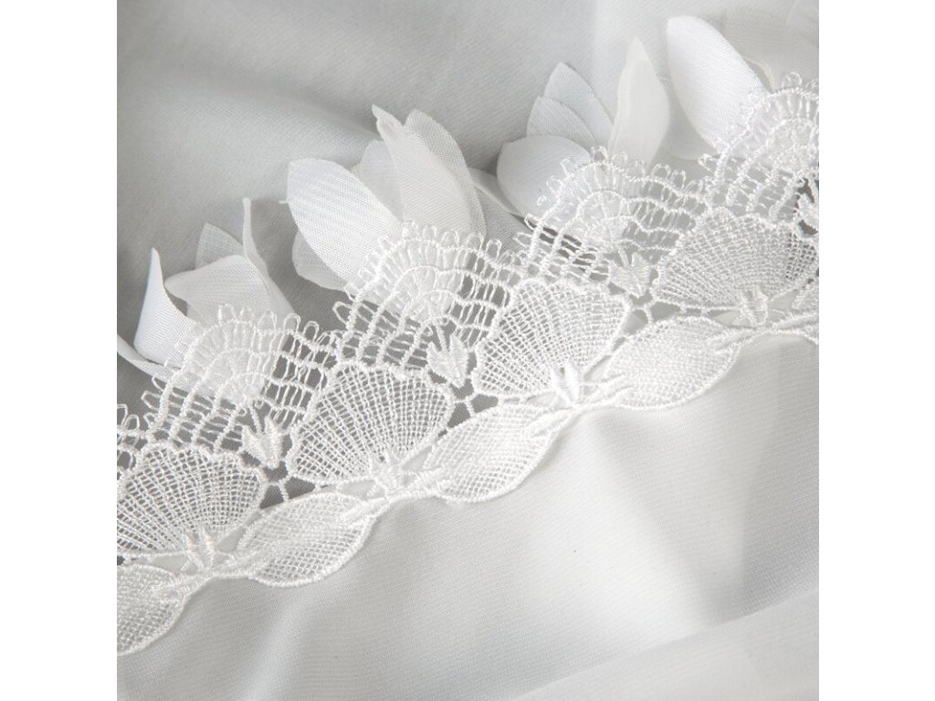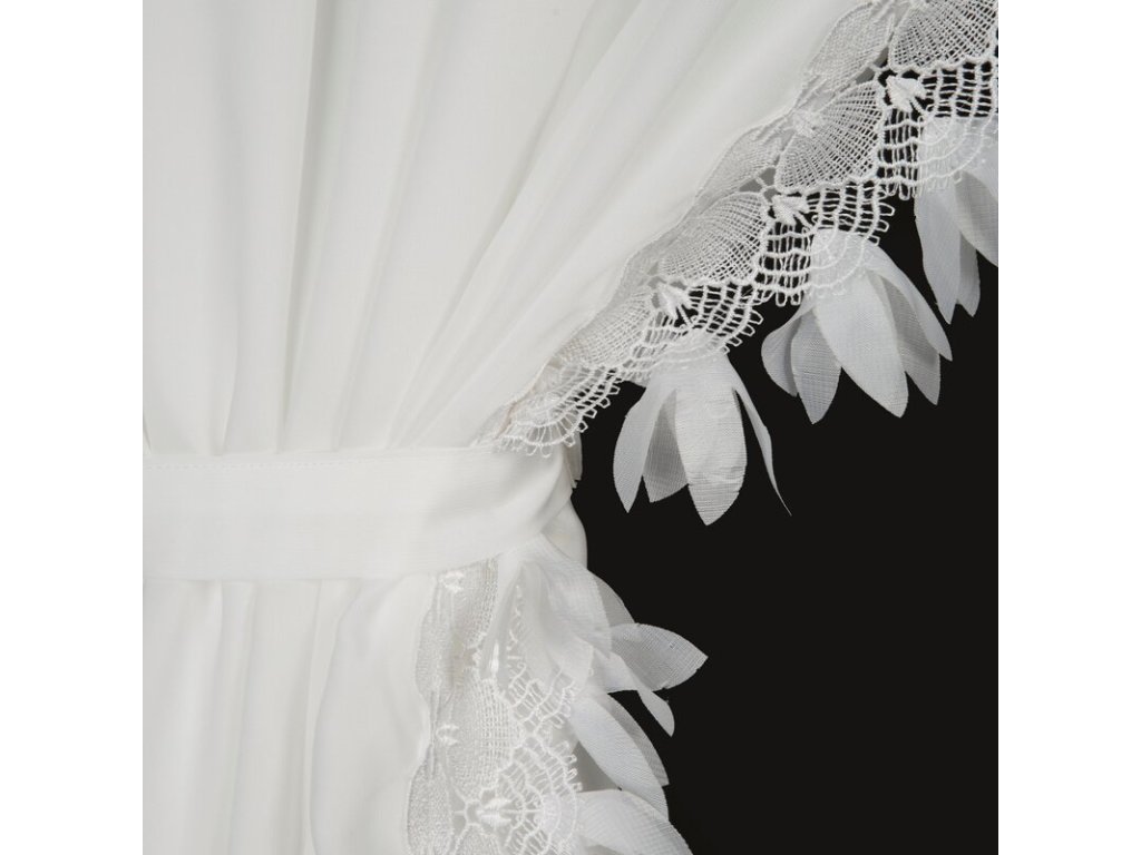 A függöny 100%-ban kiváló minőségű poliészterből készült, 60 GSM súlyú, így könnyű, lélegző és könnyen karbantartható. A díszes húzózsinórok finom romantikus jelleget kölcsönöznek az anyagnak, és lehetővé teszik a kényelmes megkötést.